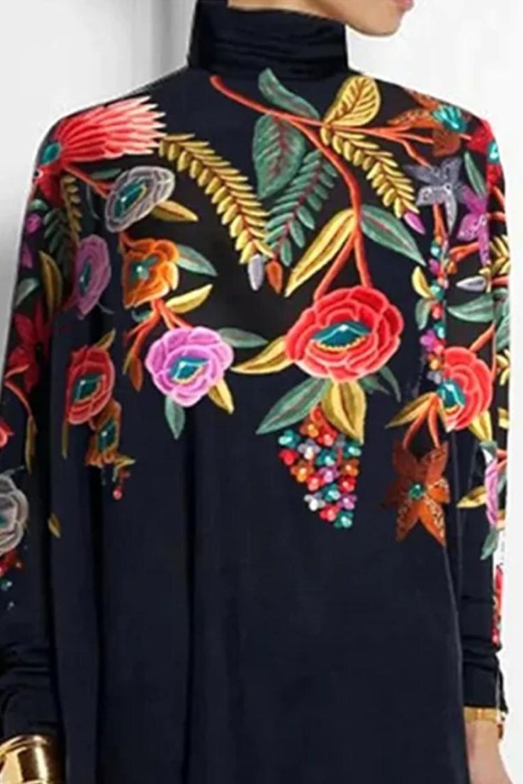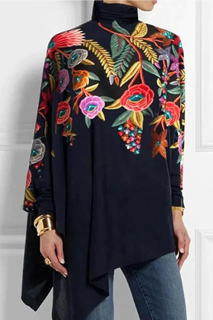 - Praktyczna bluzka damska o asymetrycznym kroju i kwiatowym wzorze, odpowiednia na co dzień.