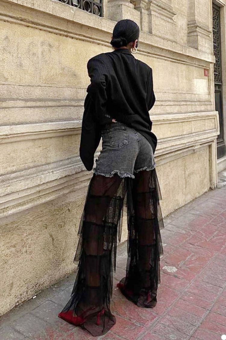 - Będziesz wyglądać świetnie! Model posiada wysoką talię, która doskonale dopasowuje się do każdej sylwetki oraz wygodne nogawki wykonane z przezroczystego tiulu.