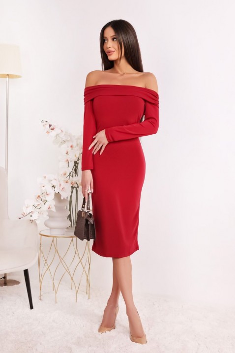 - Model ma długie rękawy, odsłonięte ramiona i dopasowany krój, który podkreśla sylwetkę.