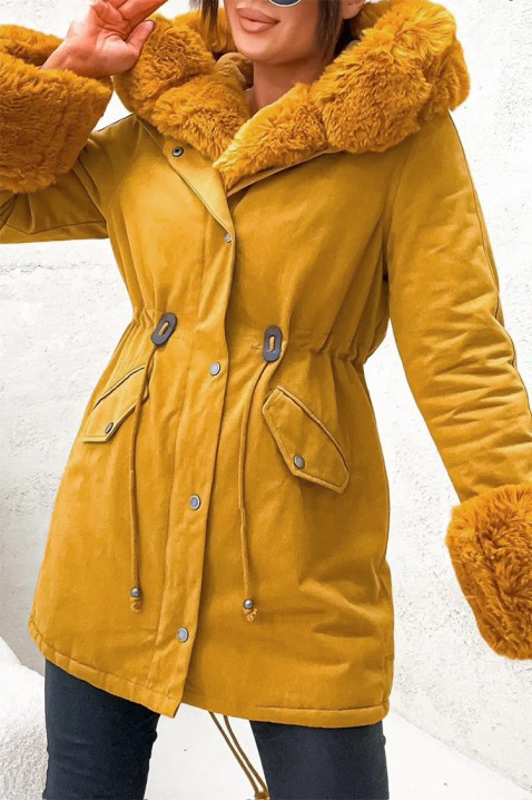 - Krój jest wygodny i dopasowany do każdej sylwetki. Akcentem kurtki jest wnętrze kurtki i kaptur z eko-futrem.
