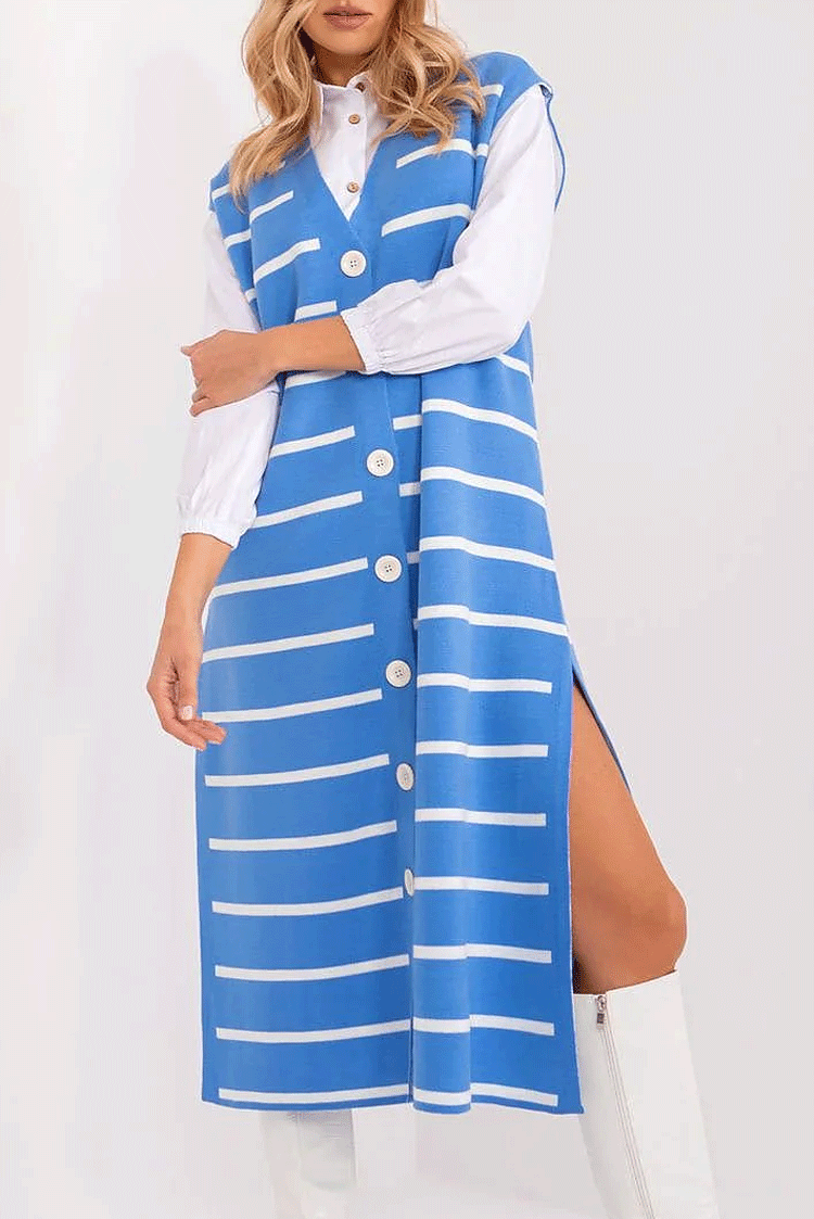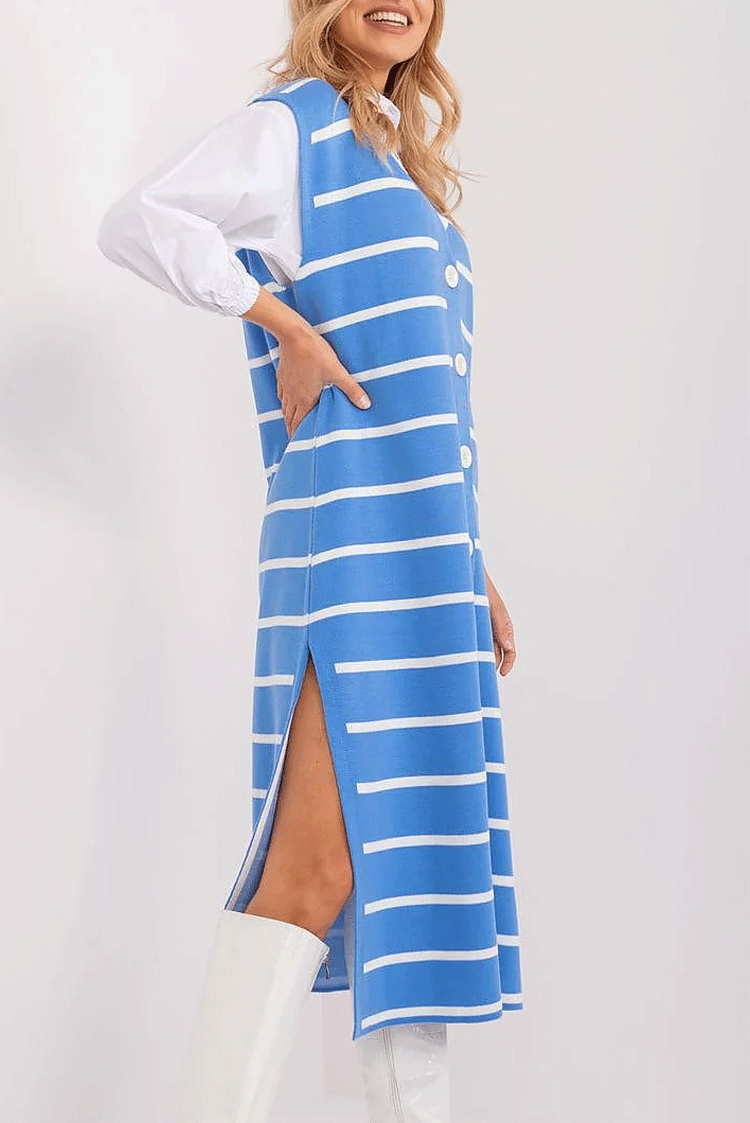 - Pochwal się swoim stylem dzięki nowoczesnej kamizelce zapinanej na guziki, wykonanej z delikatnej dzianiny w paski.