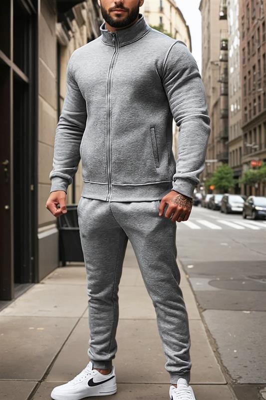 - Sportowy męski komplet składający się z dwóch części w kolorze szarym, stylowa propozycja na aktywne codzienne życie.