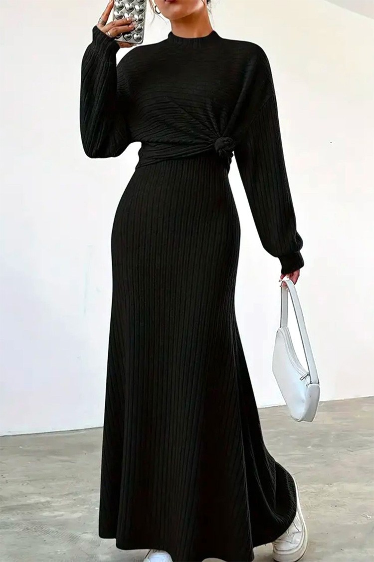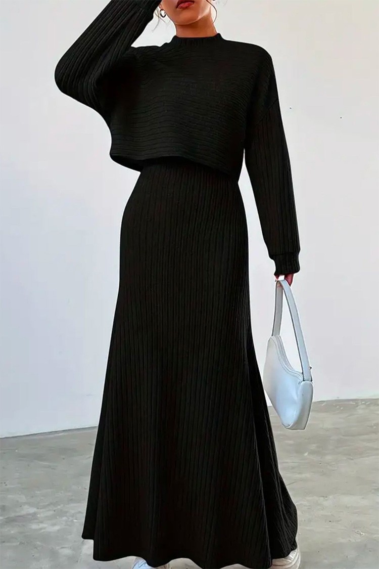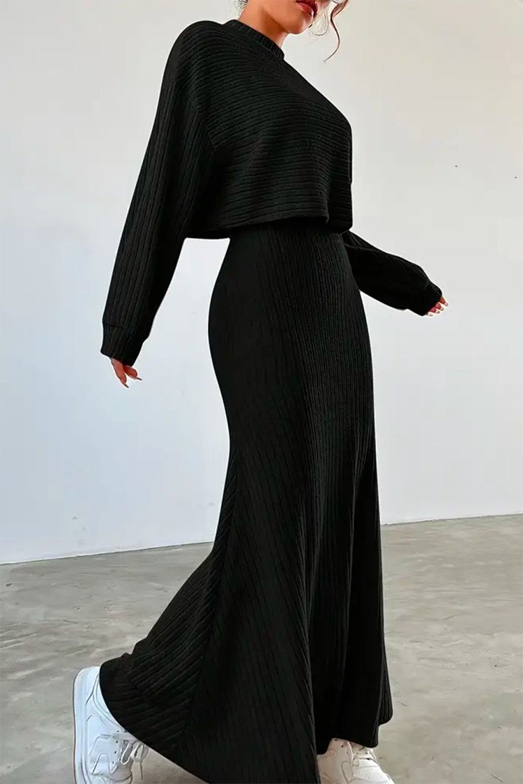 - Bluzka ma długie rękawy i luźny krój, a sukienka ma wygodne ramiączka i długą długość.