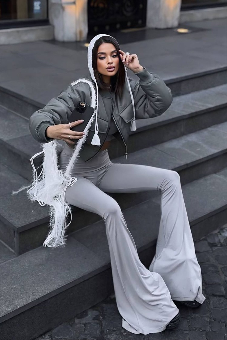 - Top jest sportowy i elegancki, ma krótkie rękawy, a spodnie mają wąskie nogawki i rozszerzane końce.