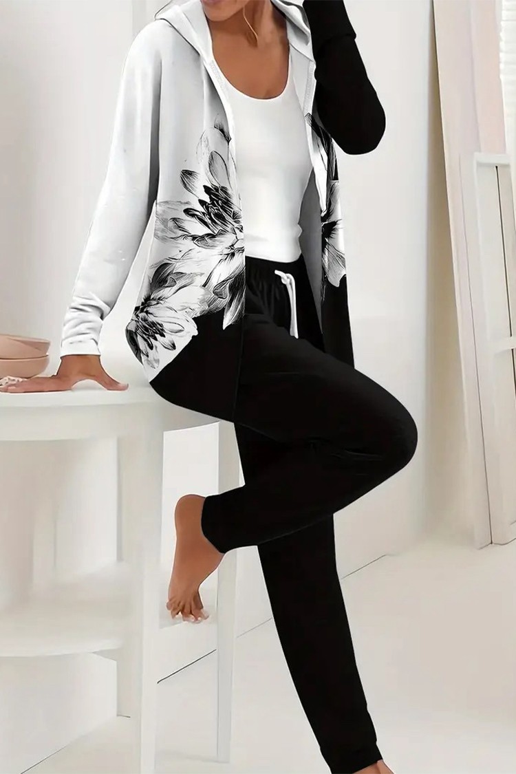 - Bluza ma ozdobny kwiatowy nadruk i kaptur, a spodnie mają luźne nogawki i elastyczną talię.