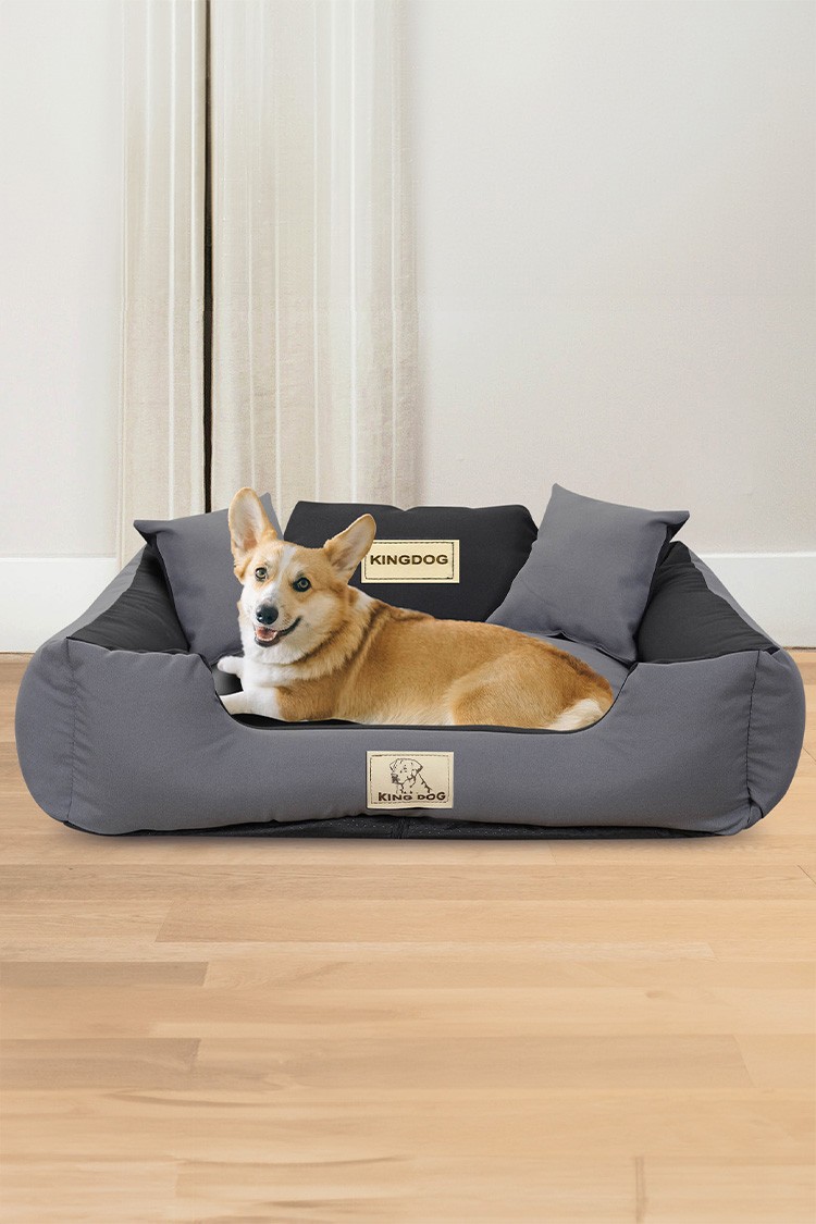 - Miękkie, puszyste legowisko dla psa w kolorze szarym, z poduszkami o wymiarach 75 cm X 65 cm.