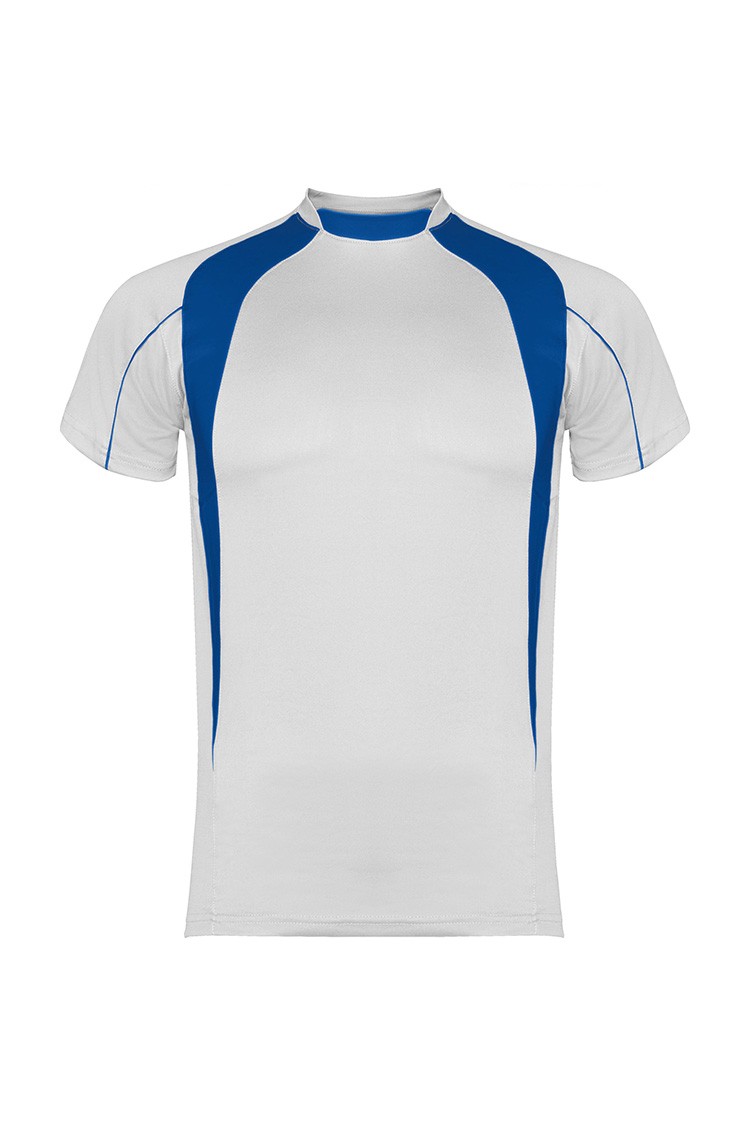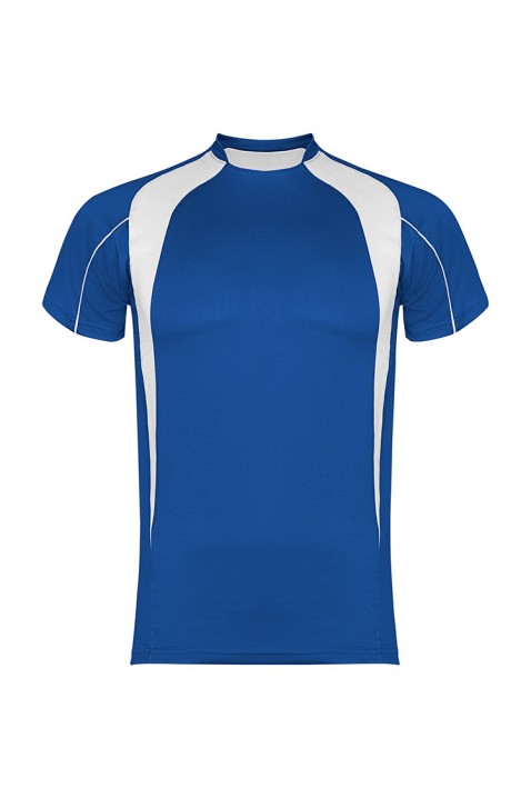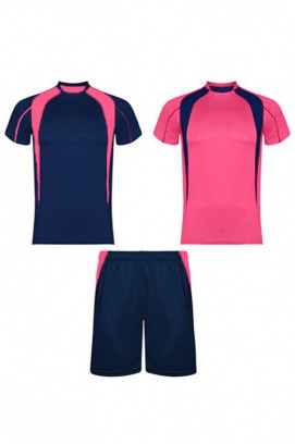 - Dziecięcy zestaw sportowy składający się z trzech części, składający się z dwóch koszulek w różnych kolorach i spodenek.