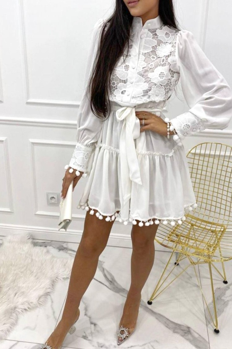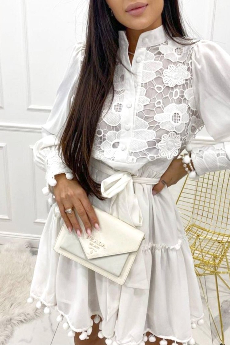 - Model ma długie rękawy, luźny krój, koronkę i wstążkę z przodu.