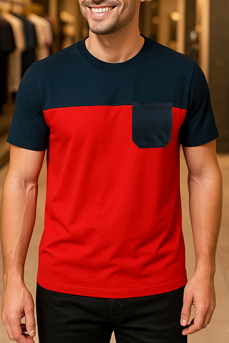 - Męski T-shirt w kontrastowych kolorach, z okrągłym dekoltem ze ściągaczem i kieszenią z boku, idealny na co dzień.