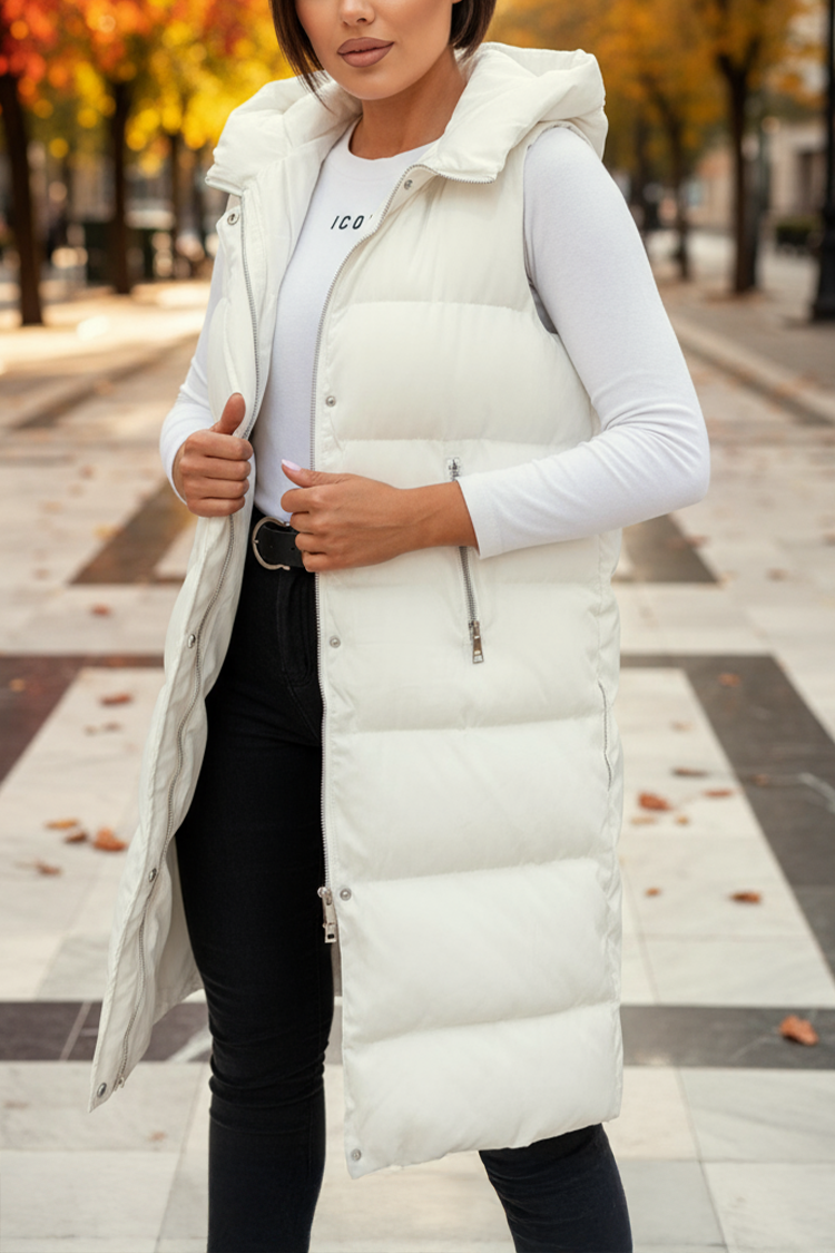 - Kamizelka ma klasyczny krój, wygodny kołnierz i długi krój.