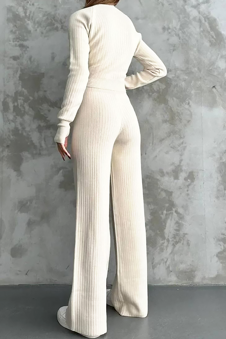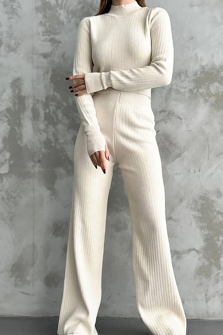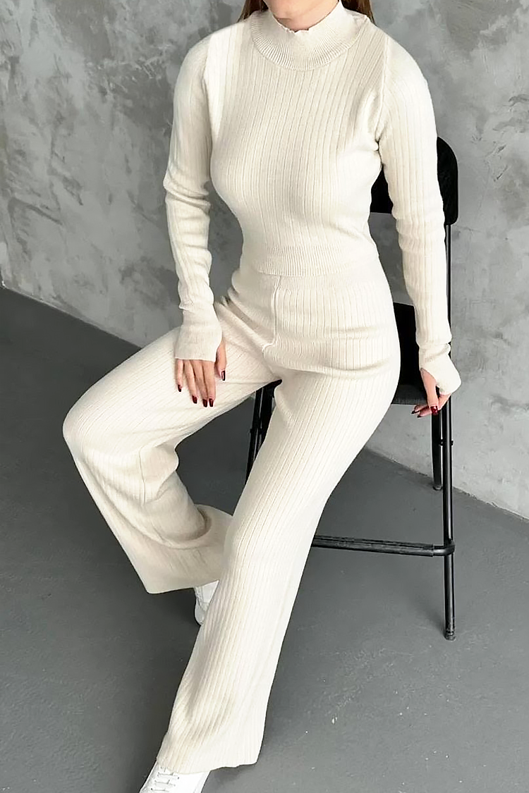 - Bluzka ma standardową długość i dopasowany krój, a spodnie są rozkloszowane i mają wysoki stan.