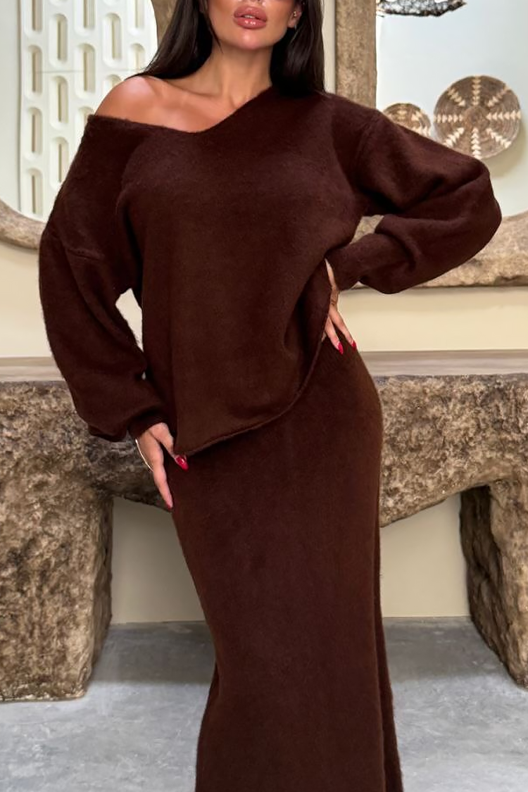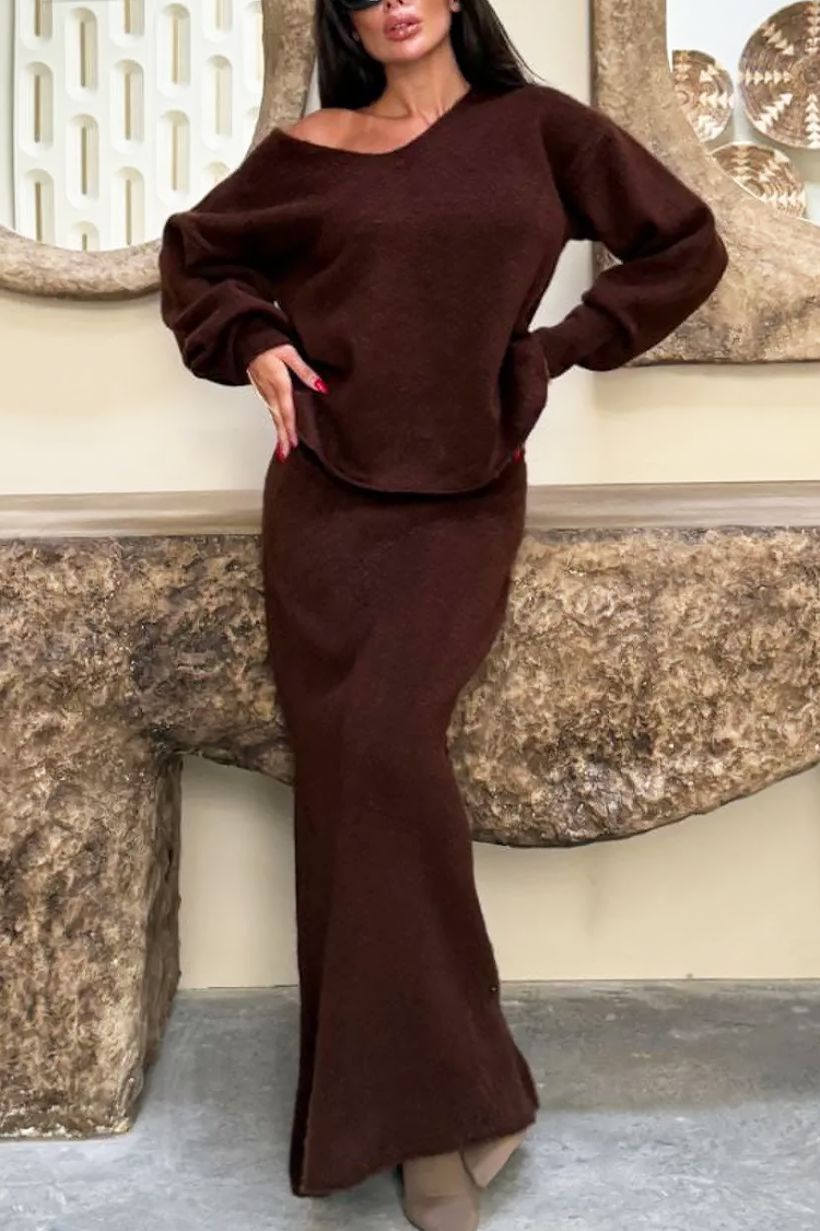 - Atrakcyjny dwuczęściowy komplet, składający się ze swetra i długiej spódnicy, idealny na co dzień.