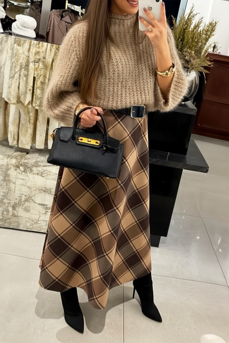 - Model ma wysoki stan, efektowny wzór w kratę i wygodny krój, pasujący do każdej sylwetki.