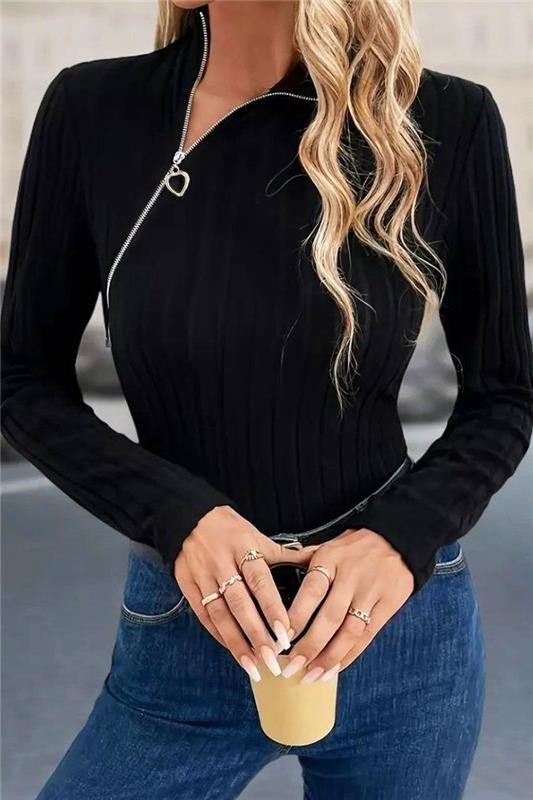 - Idealnie dopasowuje się do każdej sylwetki. Model ma atrakcyjny krój, długie rękawy i asymetryczny dekolt zapinany na zamek.