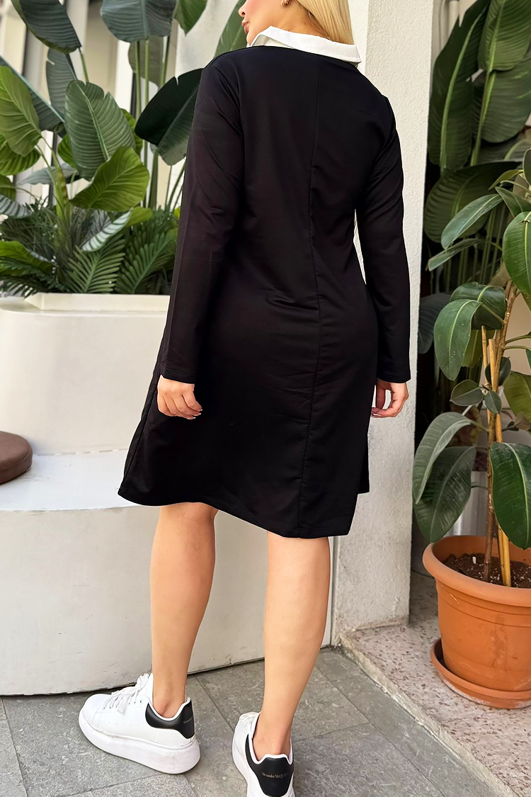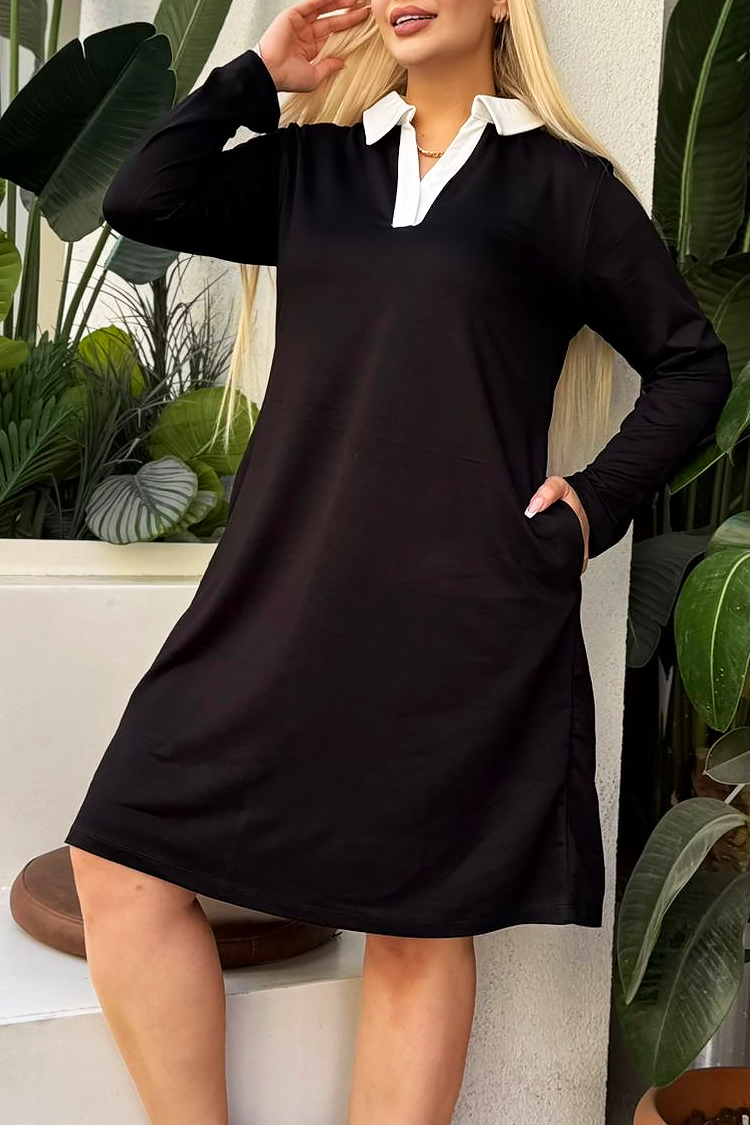 - Sukienka ma wygodny i luźny krój, długie rękawy, dekolt w serek i efektowny kołnierz.