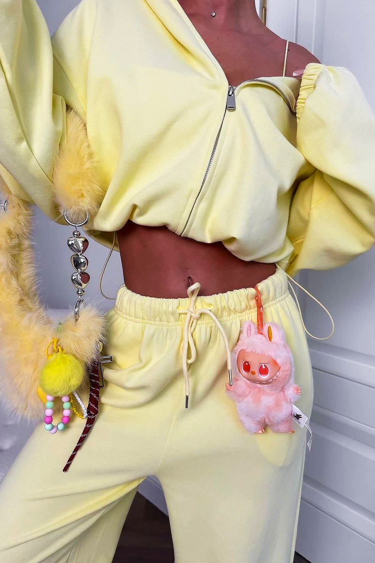 - Krótka bluza z kapturem, w połączeniu ze spodniami z wysokim elastycznym pasem i wycięciem, tworzy nowoczesny look.