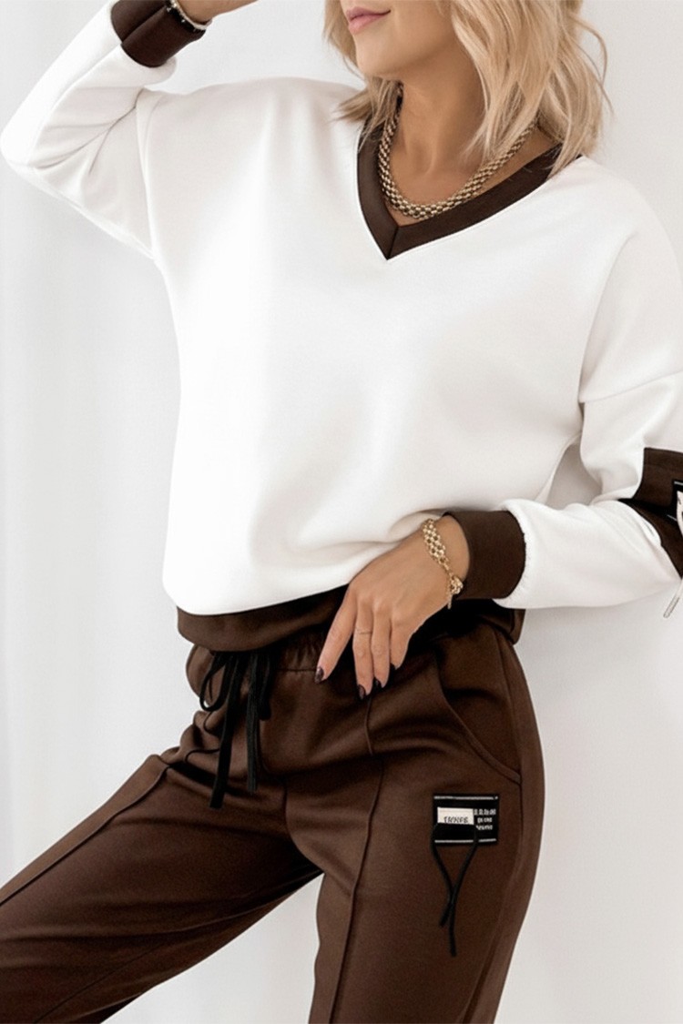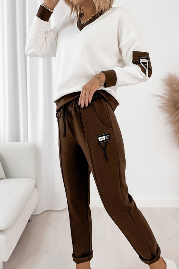 - Elegancki, dwuczęściowy komplet, składający się z bluzki i spodni.