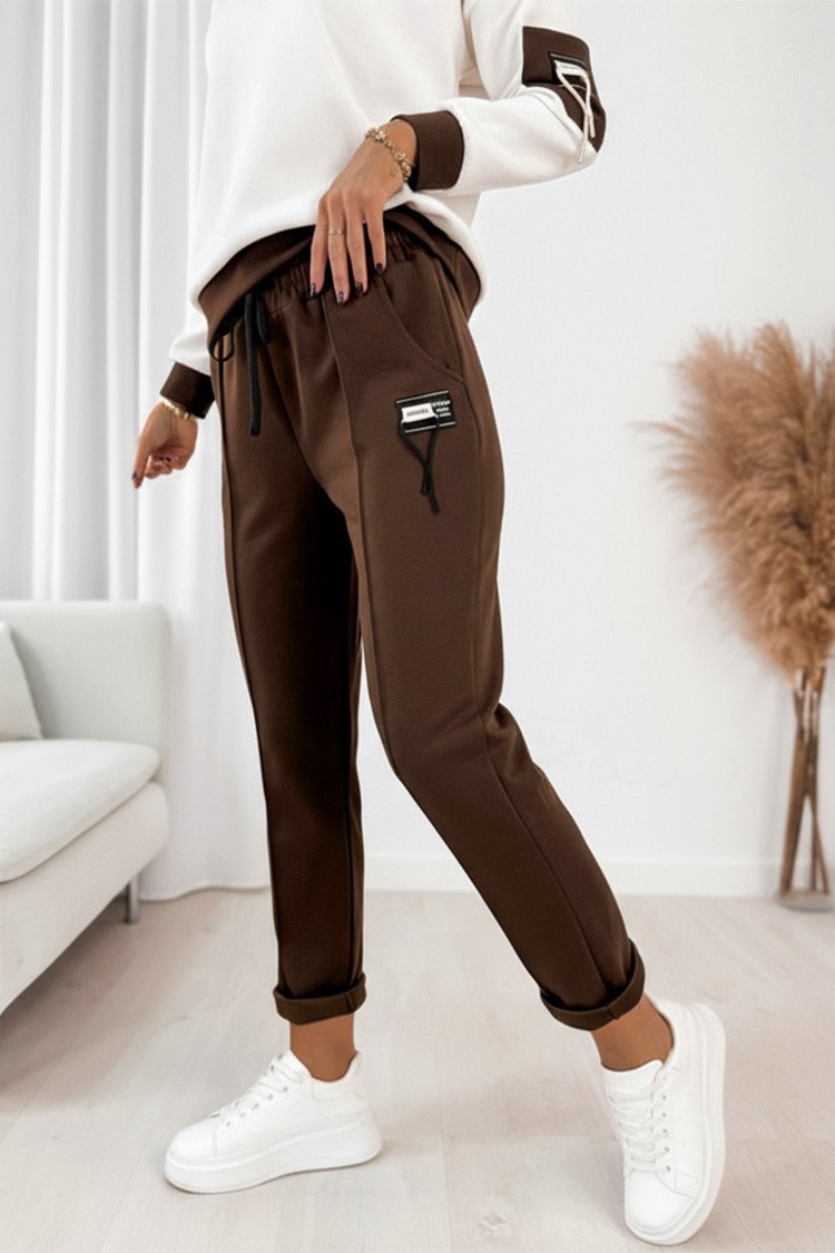 - Bluzka ma długi rękaw i klasyczny krój, a spodnie mają wygodne nogawki i wiązanie w talii.