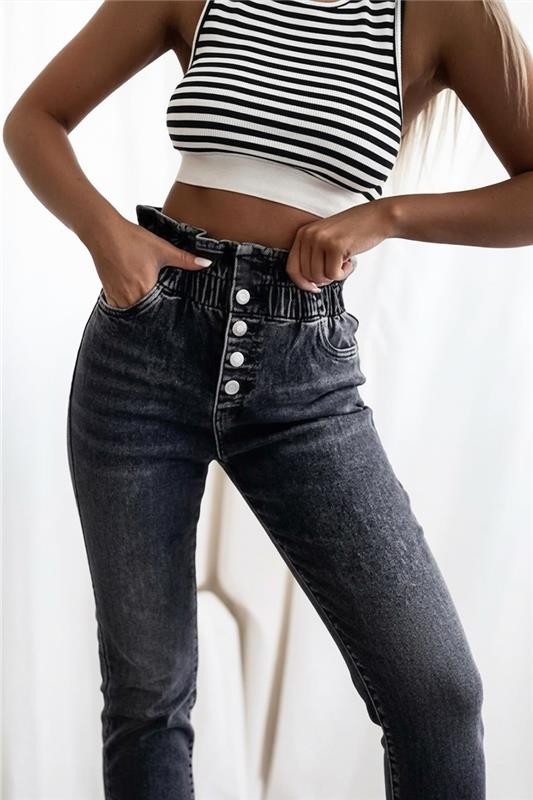 - Model ma wysoki stan, wygodny krój i efektowne guziki z przodu.