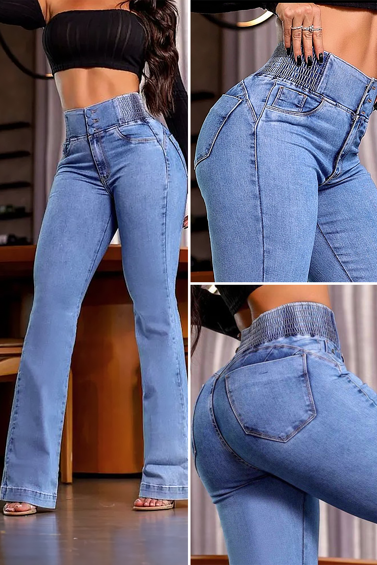 - Wysoki stan i dopasowany krój pięknie podkreślają krągłości i optycznie wydłużają sylwetkę.