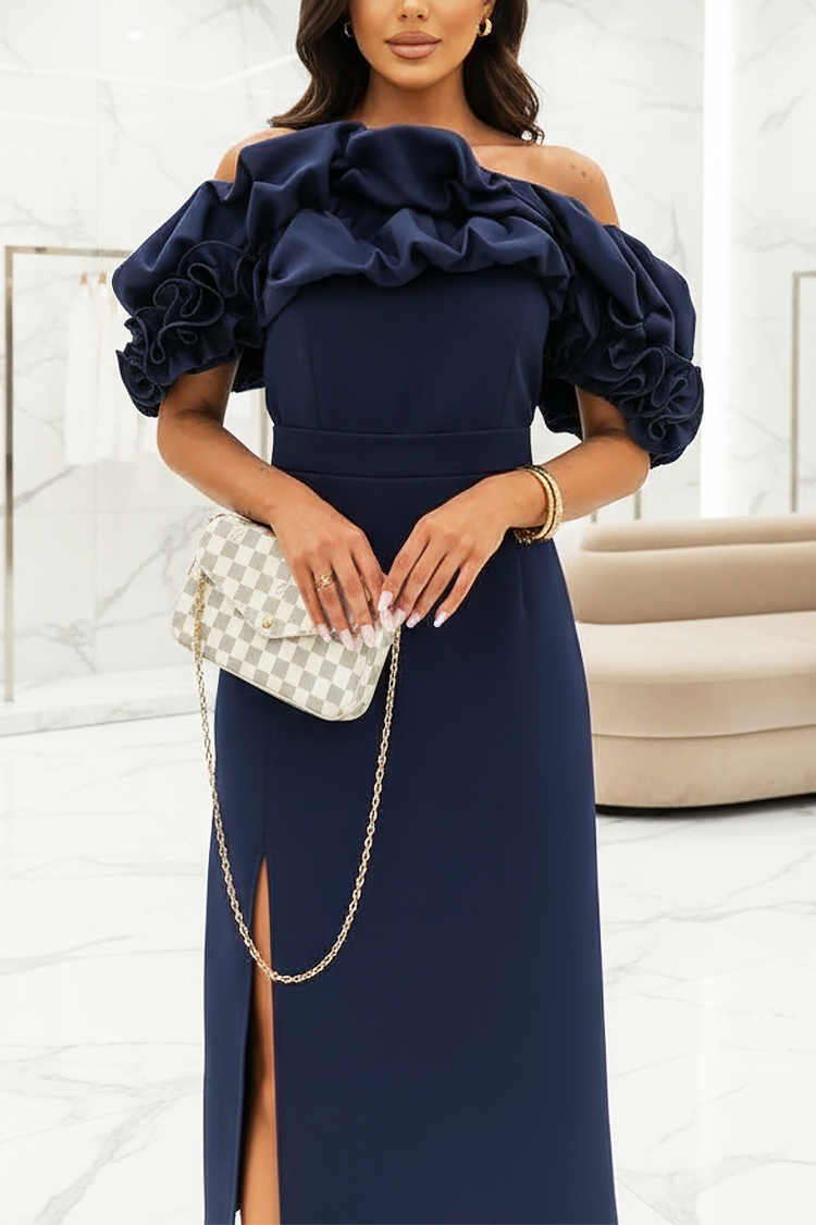 - Sukienka ma otwarty krój, rozcięcie i atrakcyjny krój.