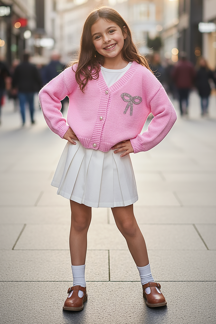 - Nowoczesny kardigan dla dziewczynek o atrakcyjnym wzorze, idealny na chłodniejsze dni.