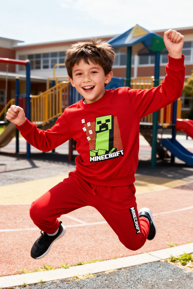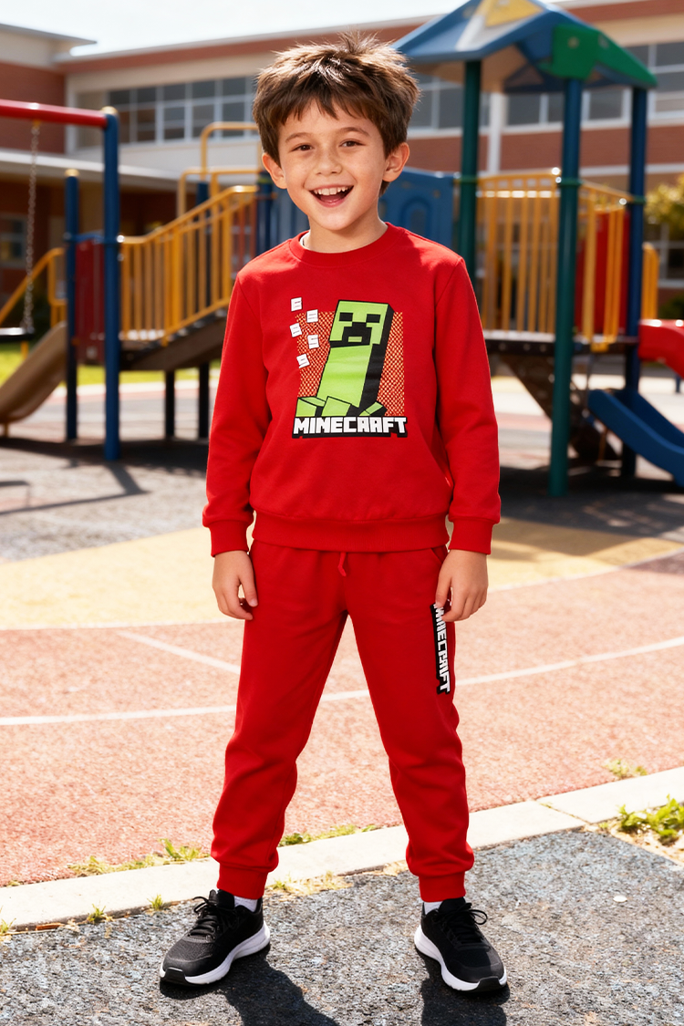 - Dwuczęściowy komplet dziecięcy, składający się z bluzki i spodni z jednolitym wzorem i motywem Minecraft.