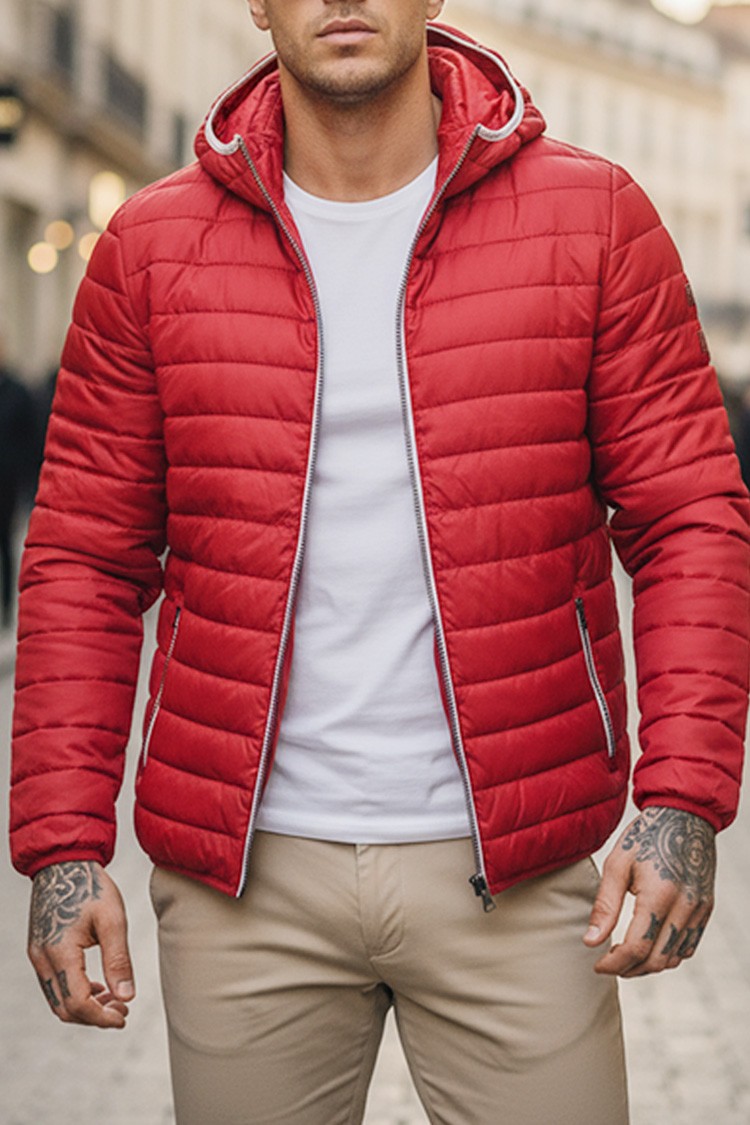 - Wygodna męska kurtka z poziomym pikowaniem w kolorze czerwonym o sportowym, codziennym stylu.