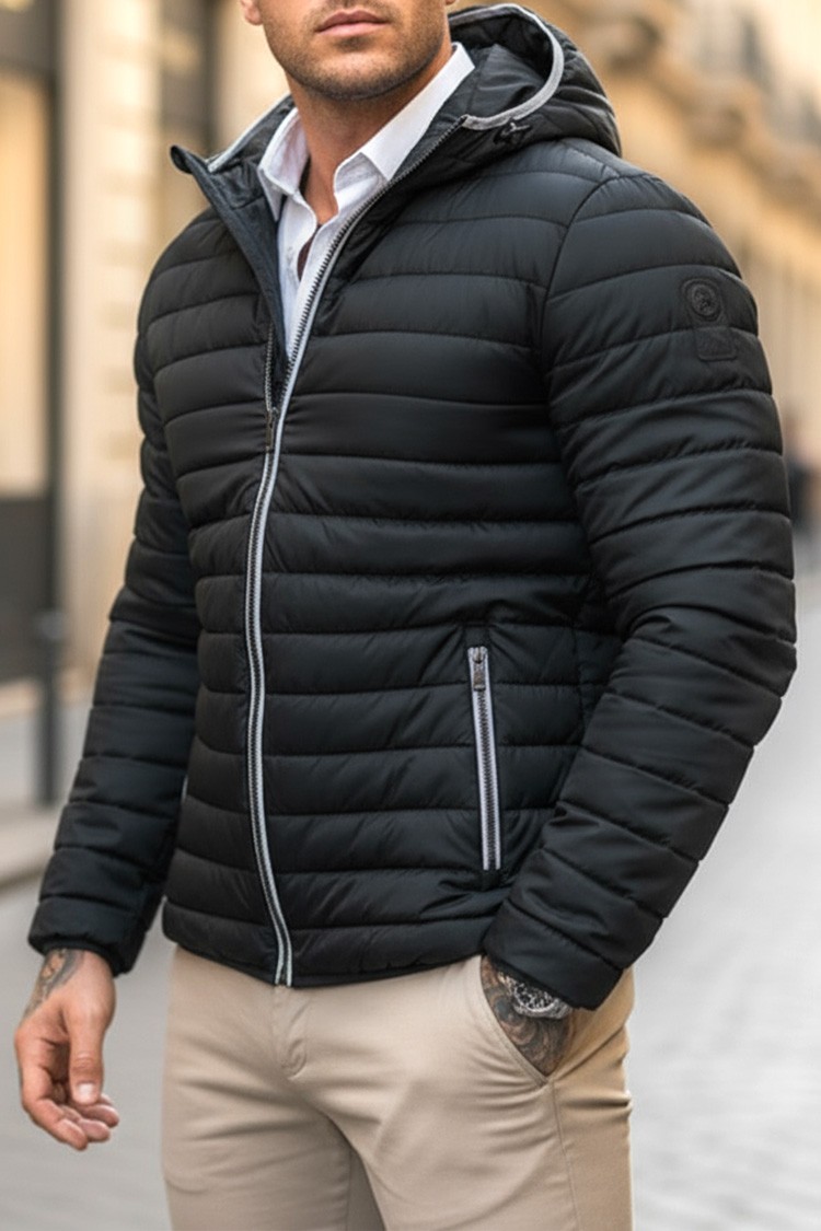 - Wygodna męska kurtka z poziomym pikowaniem w kolorze czarnym o sportowym, codziennym stylu.