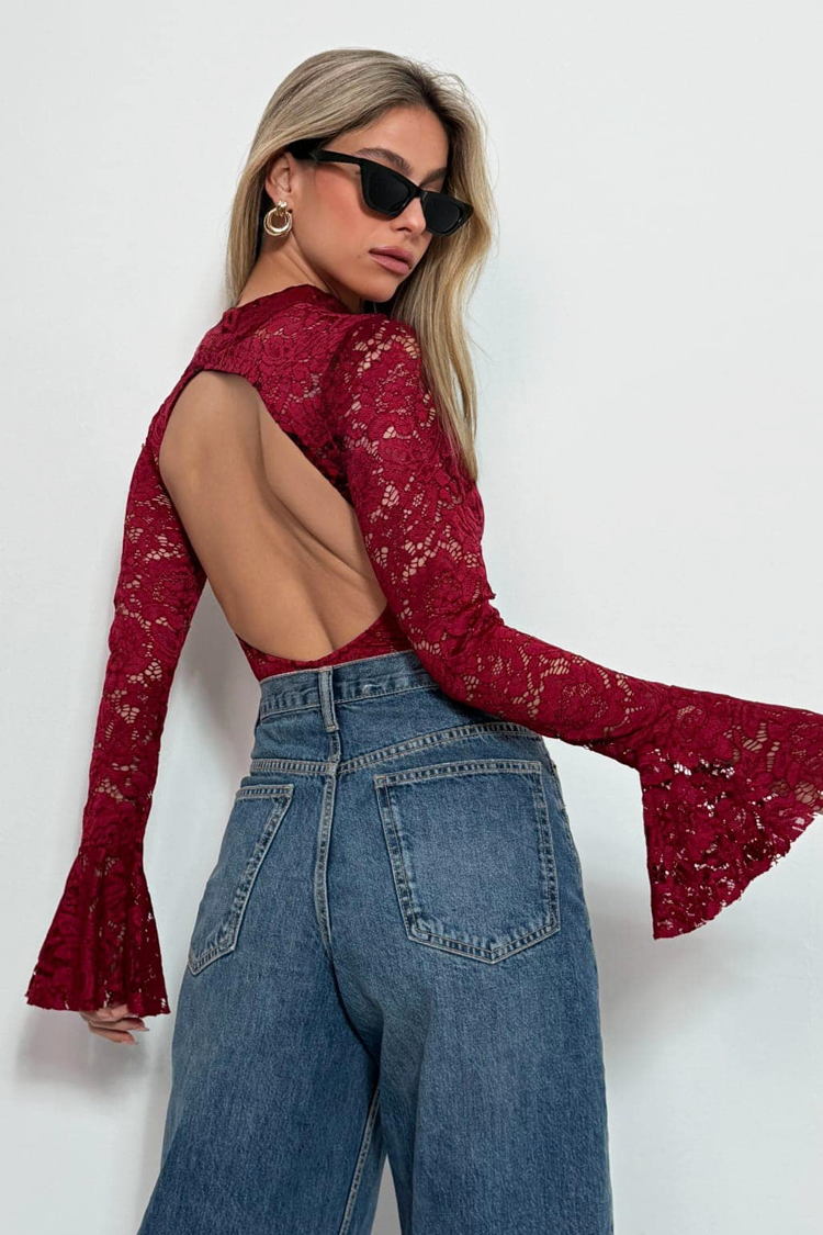 - Idealnie dopasowuje się do sylwetki. Model ma seksowną koronkę, długie, efektowne rękawy i seksowne odkryte plecy.