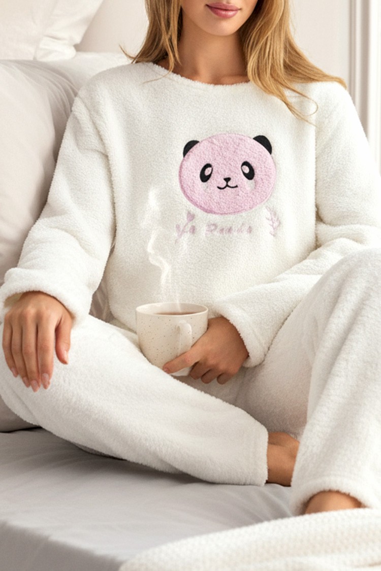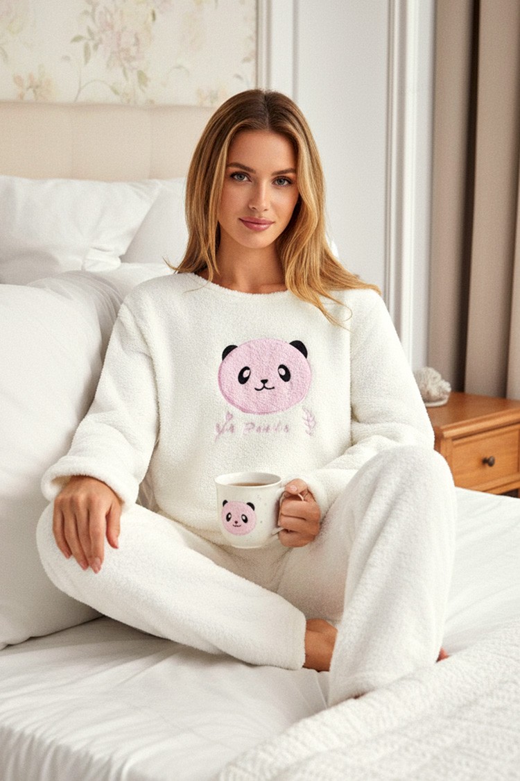 - Bluzka ma efektowny wzór z misiem, a spodnie mają wysoki stan i luźny krój.