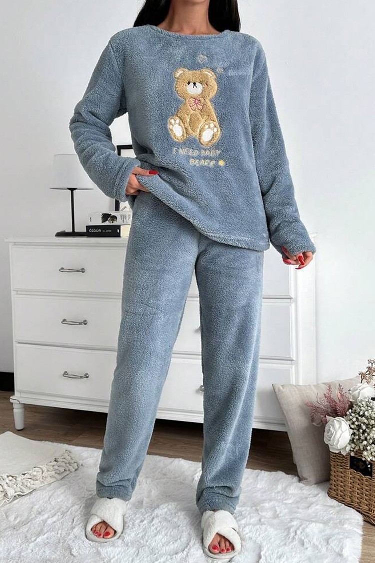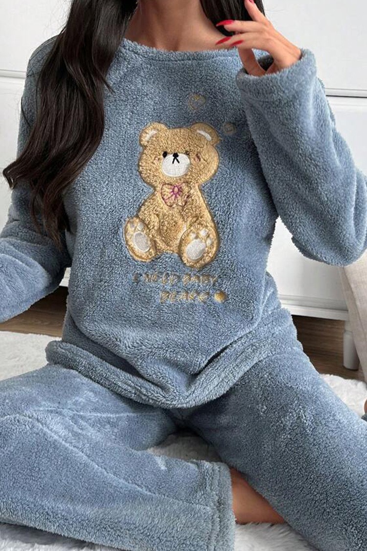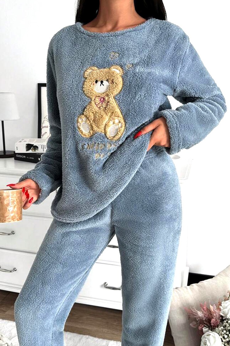 - Bluzka ma efektowny wzór z misiem, a spodnie mają wysoki stan i luźny krój.