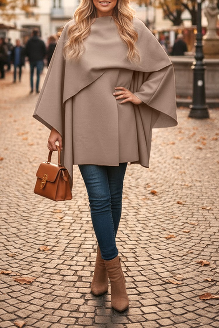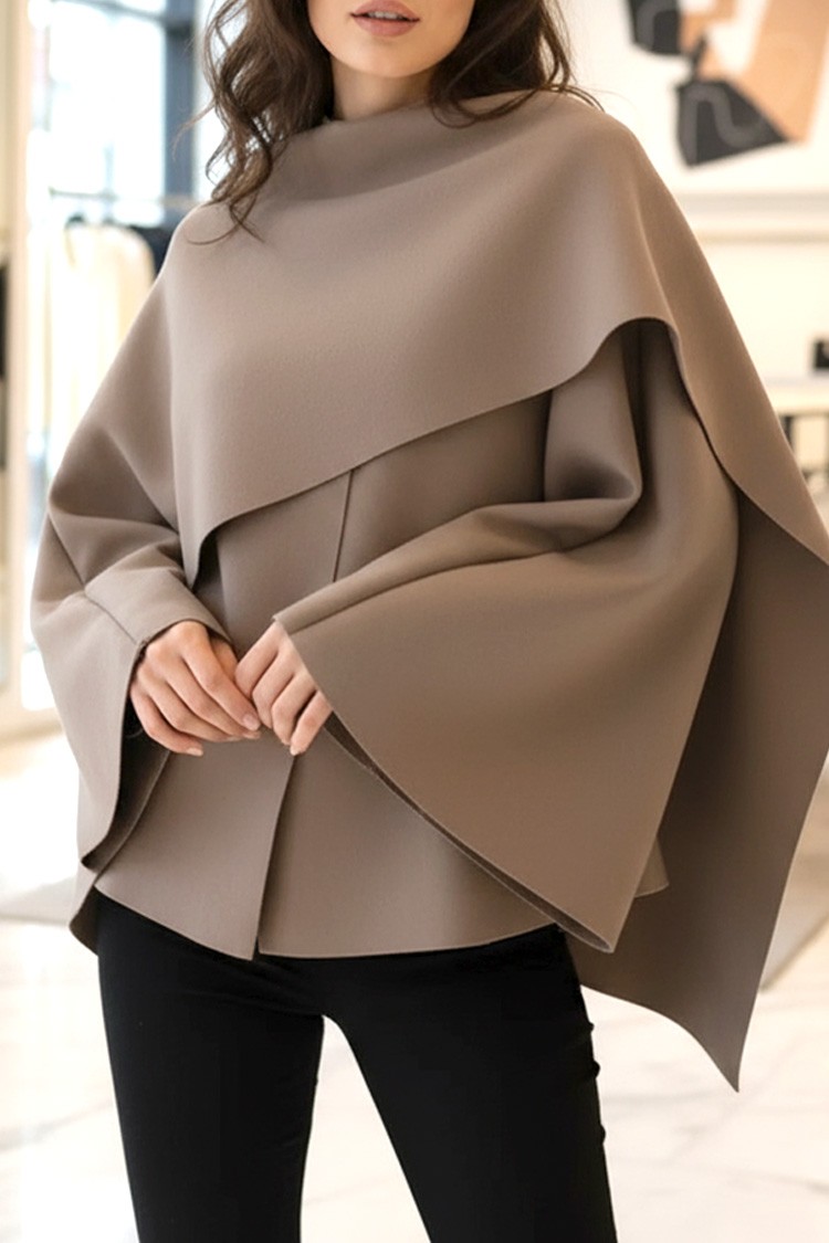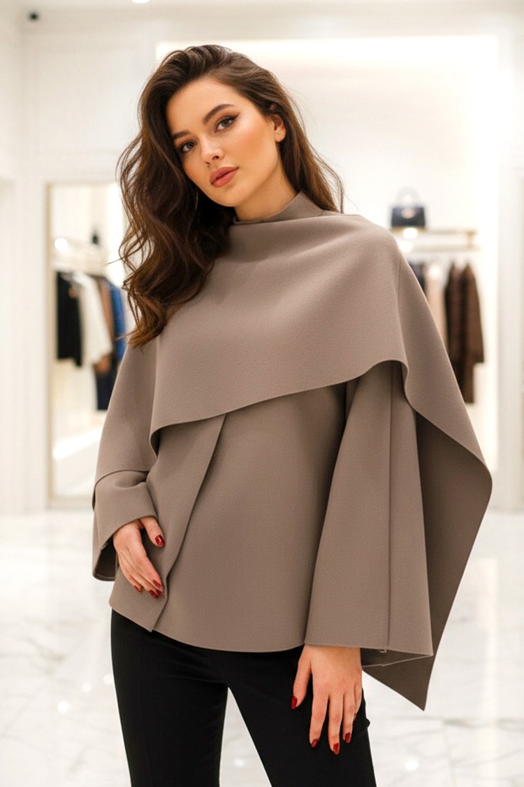 - Model ma asymetryczny krój, szerokie, efektowne rękawy i kolor mokki.