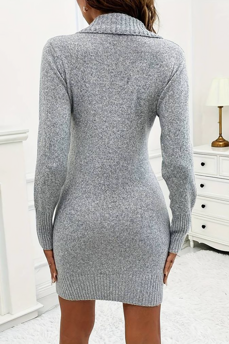 - Sukienka ma dopasowany krój, długie rękawy i prosty fason.