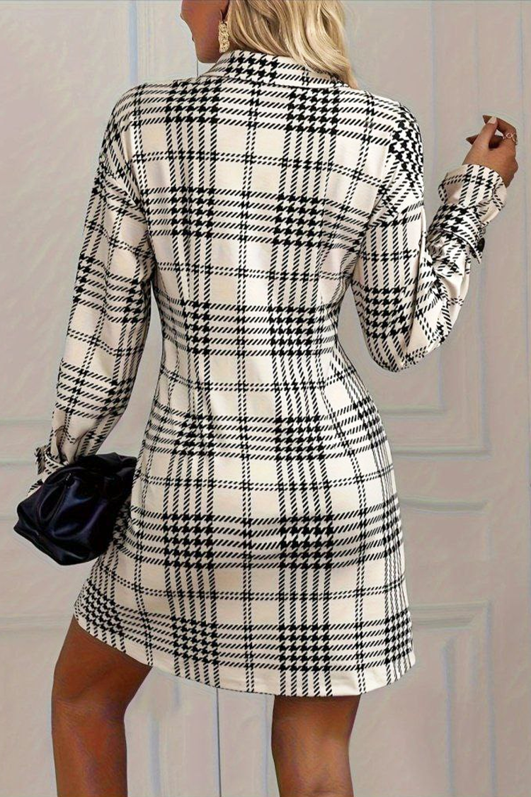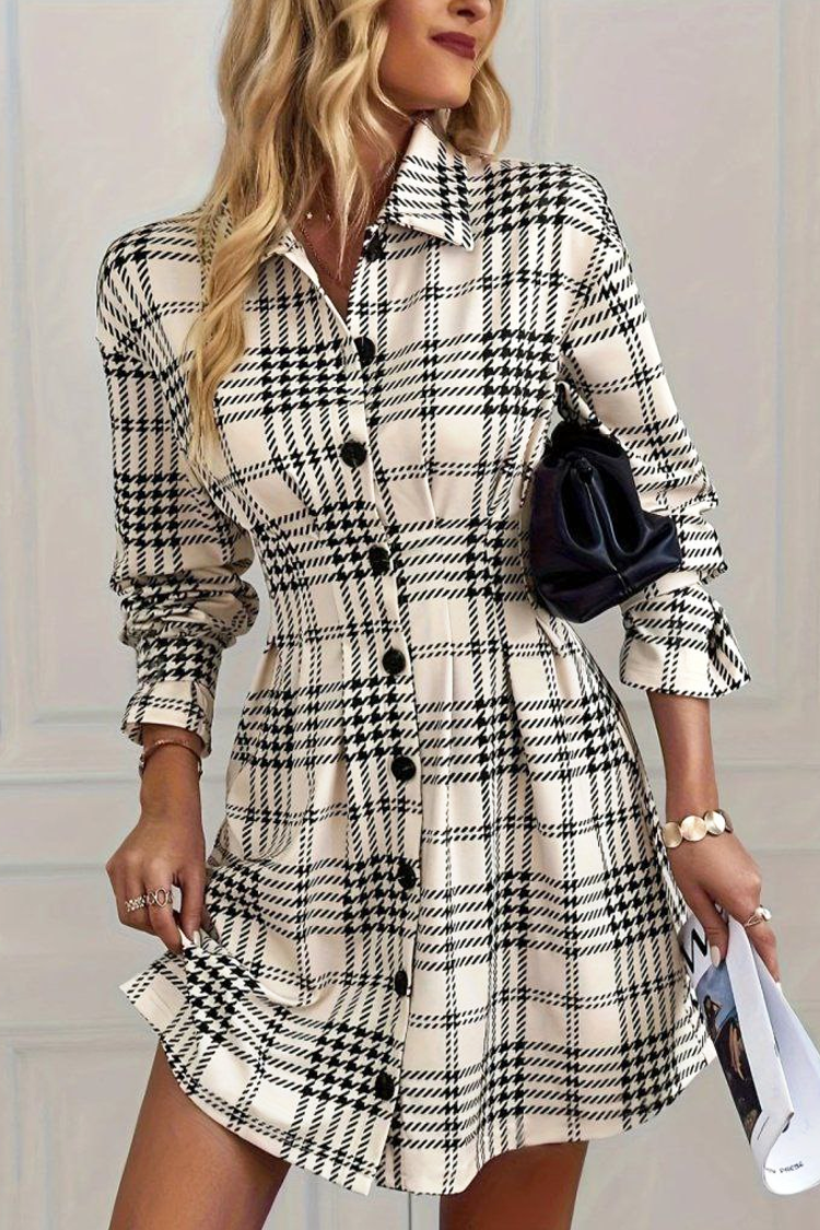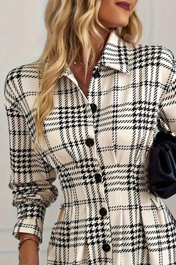 - Sukienka ma krótki fason, elegancki kołnierzyk, efektowny wzór, guziki na całej długości i długie rękawy.