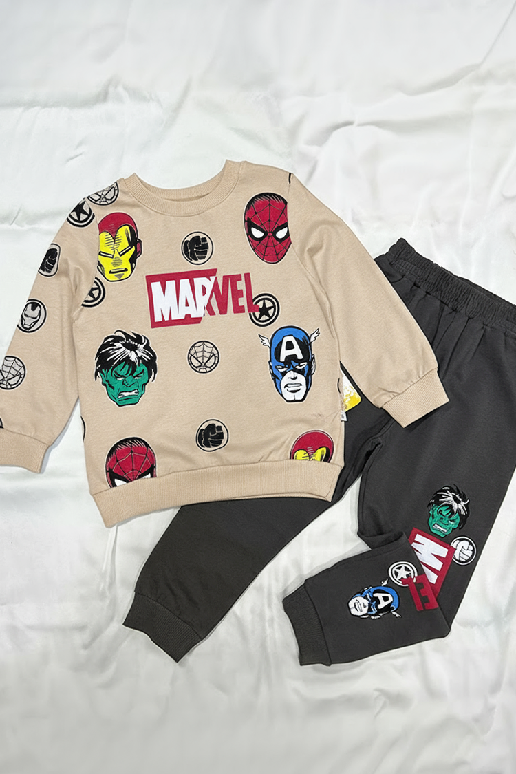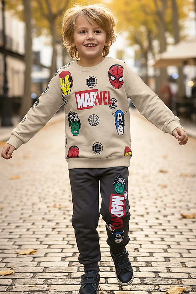- Bluzka ma długie rękawy i nadruk Marvel, a spodnie mają wysoki, elastyczny pas.