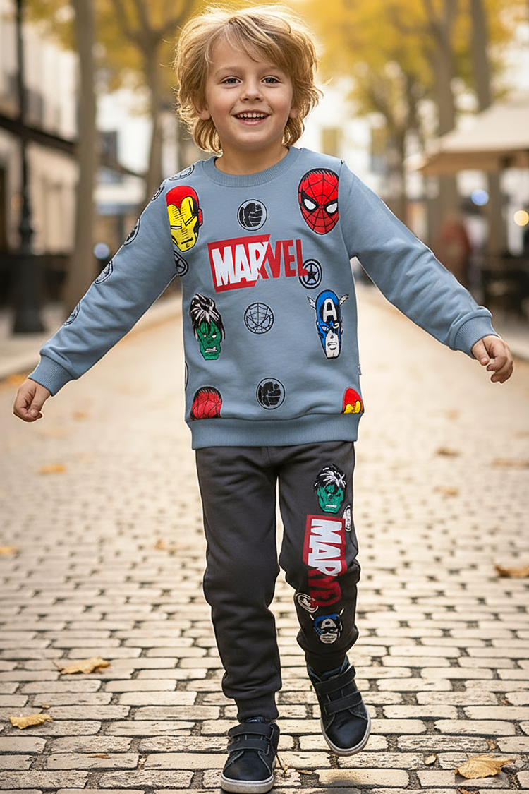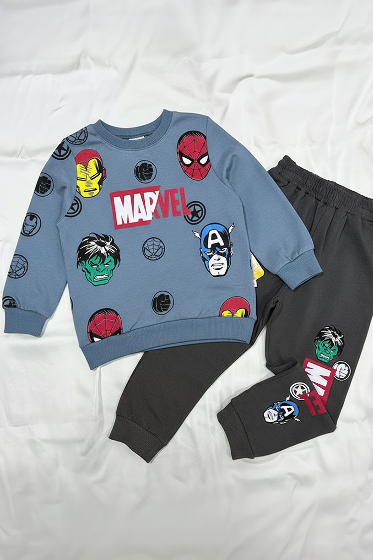 - Bluzka ma długie rękawy i nadruk Marvel, a spodnie mają wysoki, elastyczny pas.