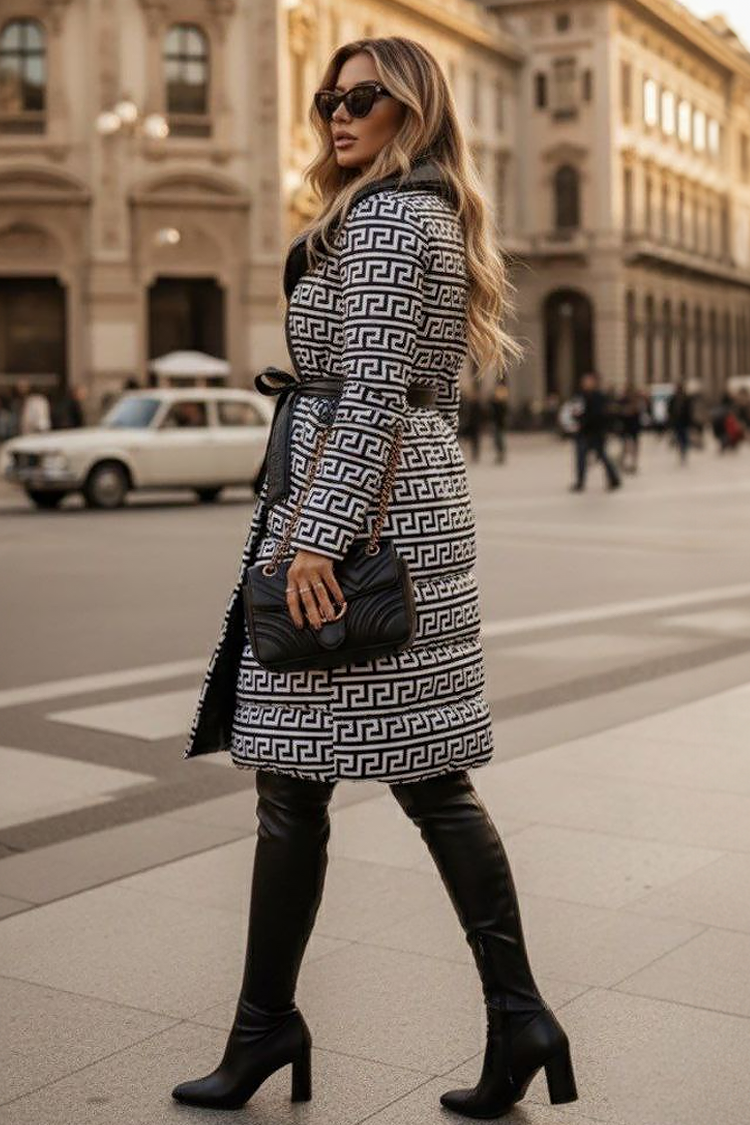 - Stylowy model z praktycznym zamkiem błyskawicznym, eleganckim kołnierzem i paskiem, który podkreśla talię i nadaje jej elegancki wygląd.