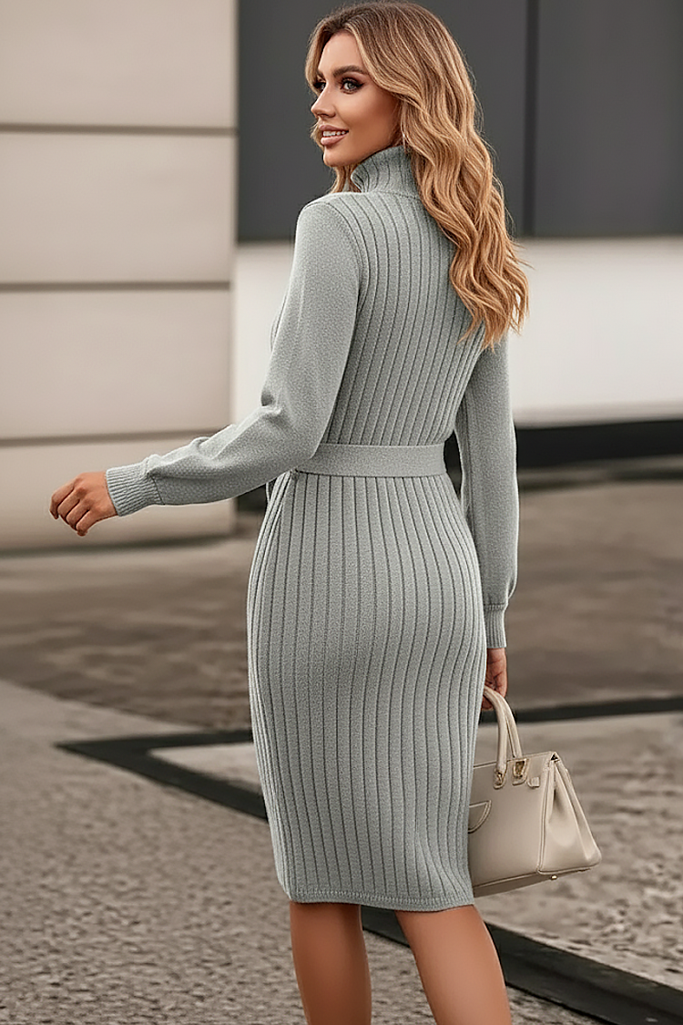 - Sukienka ma dopasowany krój, długie rękawy, pasek z tego samego materiału i kołnierz.
