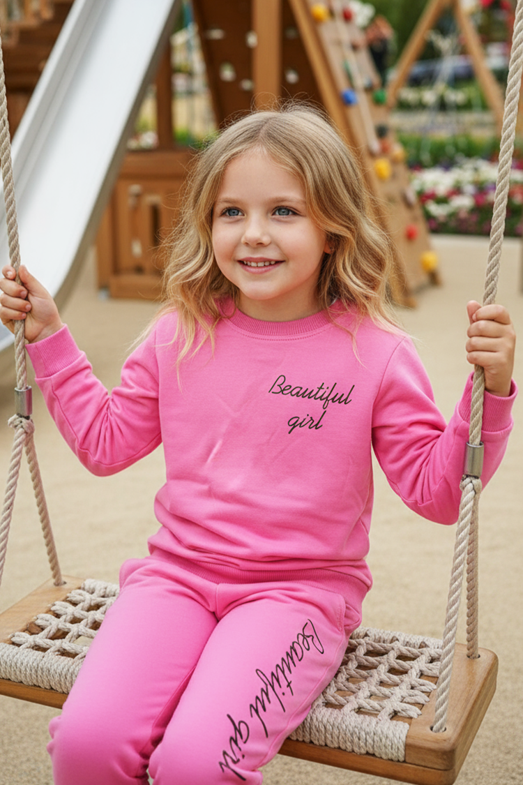 - Dwuczęściowy komplet dziecięcy dla dziewczynki, składający się z bluzki i spodni z atrakcyjnym napisem.