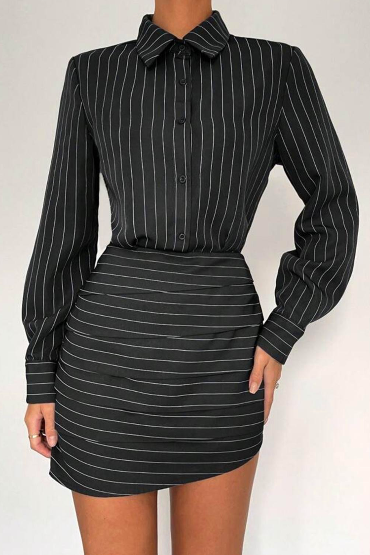 - Sukienka ma długie rękawy, krótki krój, zapięcie na guziki przy dekolcie i dopasowany krój.