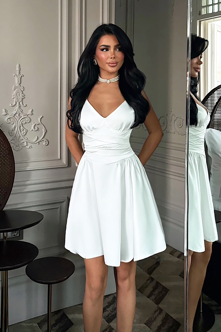 - Efektowna, krótka sukienka w kolorze białym, idealna zarówno na co dzień, jak i do eleganckich stylizacji.