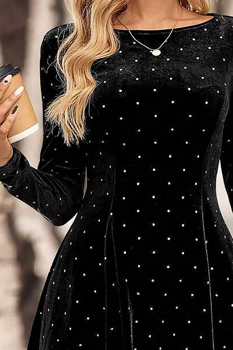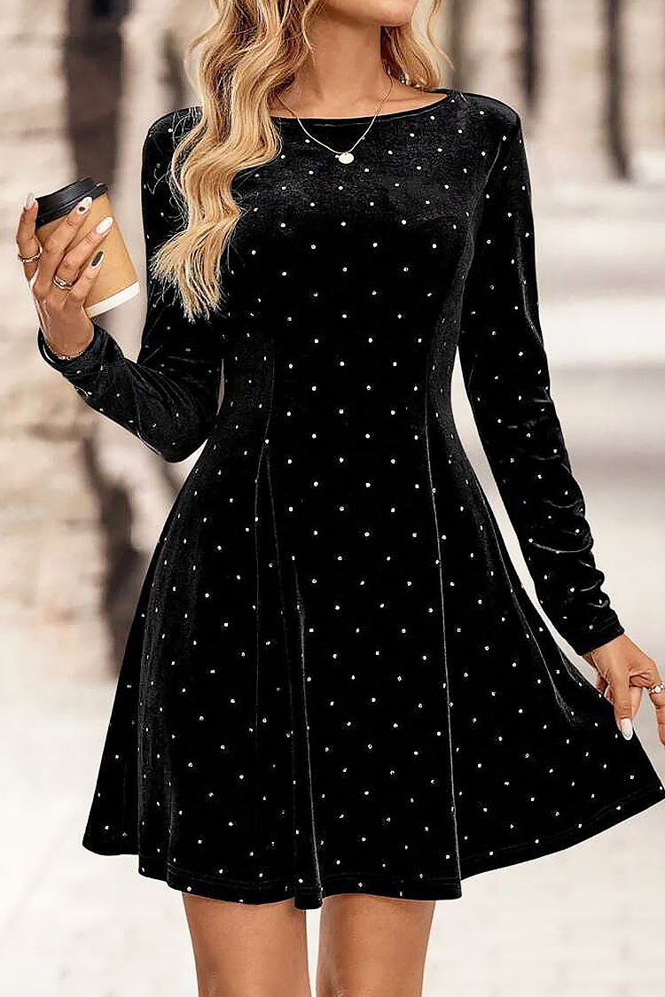 - Sukienka ma długie rękawy, dopasowany krój i efektowny wzór w groszki.