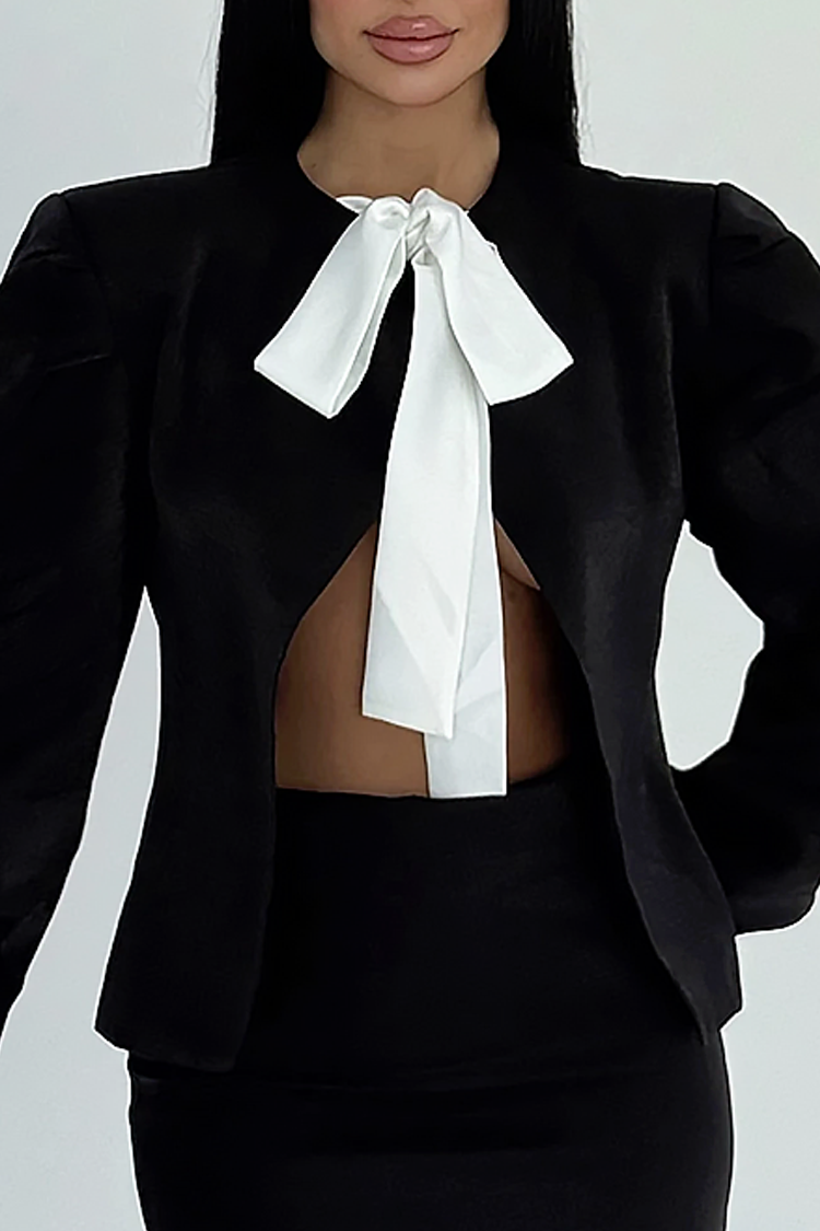 - Bluzka ma elegancki krój, długie rękawy i ozdobną wstążkę z przodu, a spódnica ma dopasowany, seksowny krój.