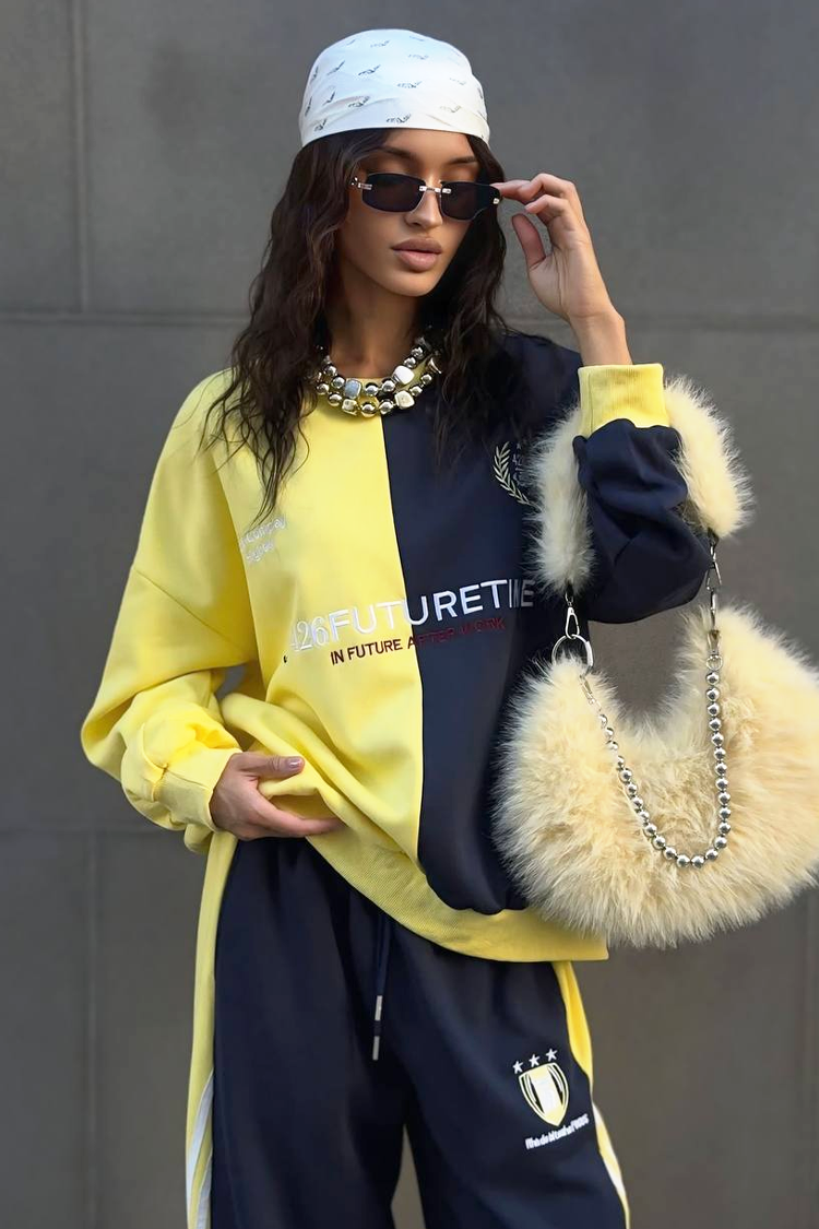 - Dwuczęściowy komplet damski na co dzień z dwukolorowym wzorem.