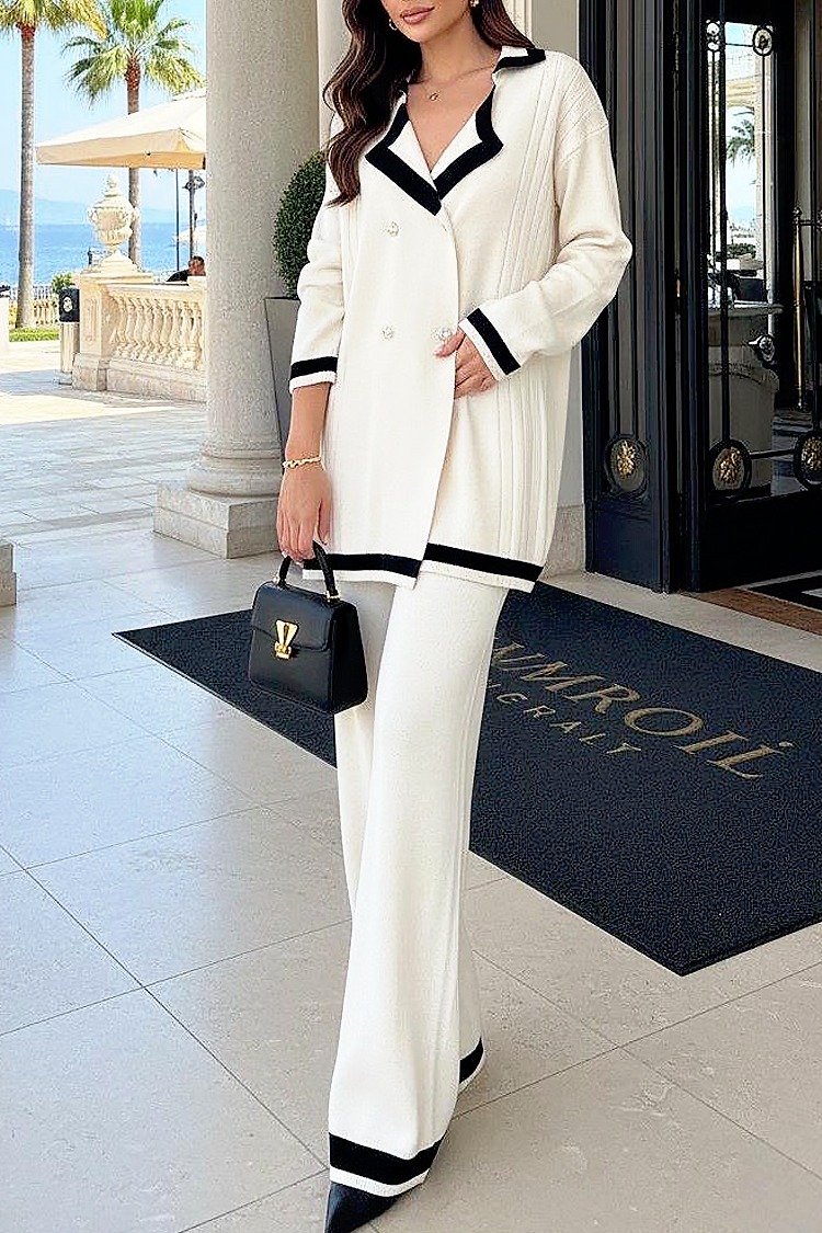 - Kamizelka ma elegancki krój, kołnierzyk i efektowne guziki, a spodnie mają rozkloszowany krój i elastyczną talię.