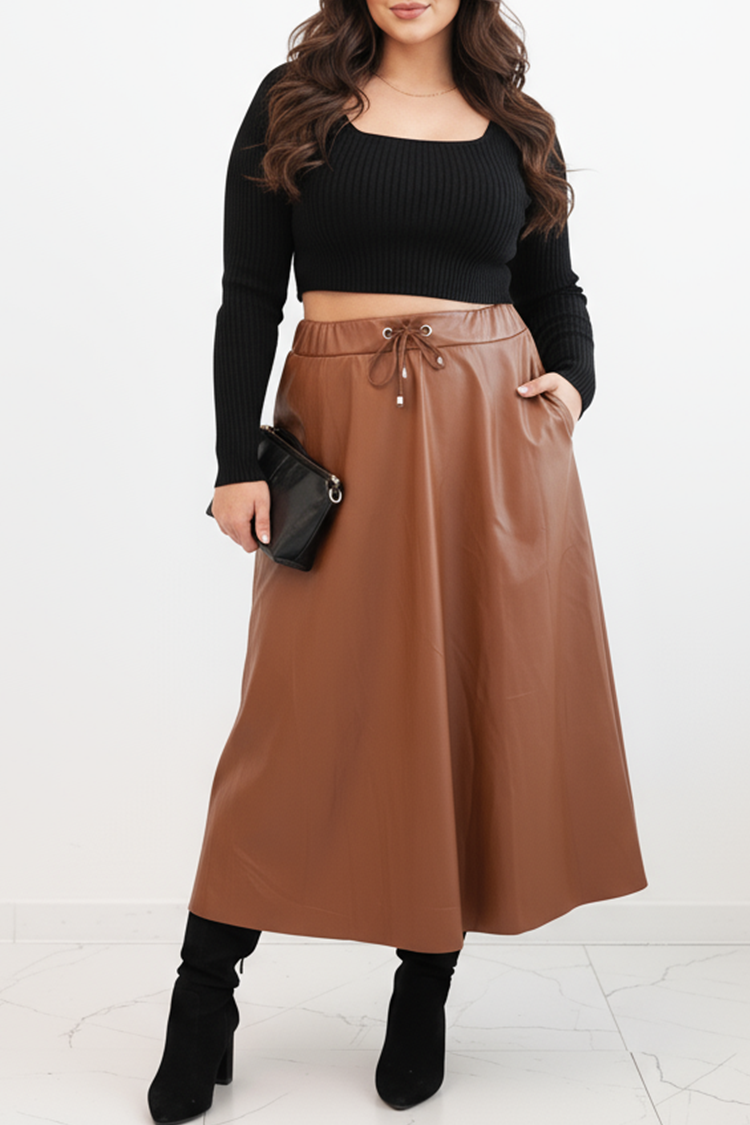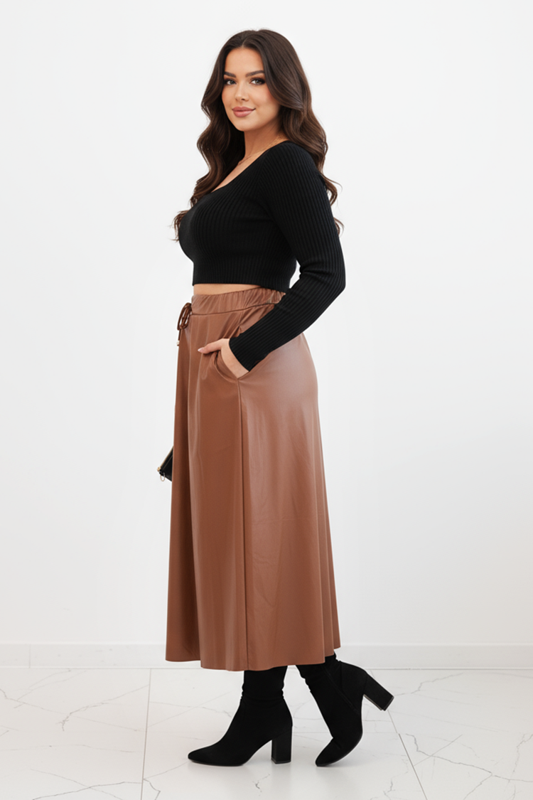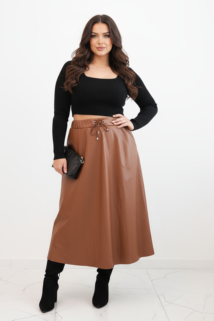- Aktualny model spódnicy midi, wykonanej z ekoskóry, idealnej na co dzień.