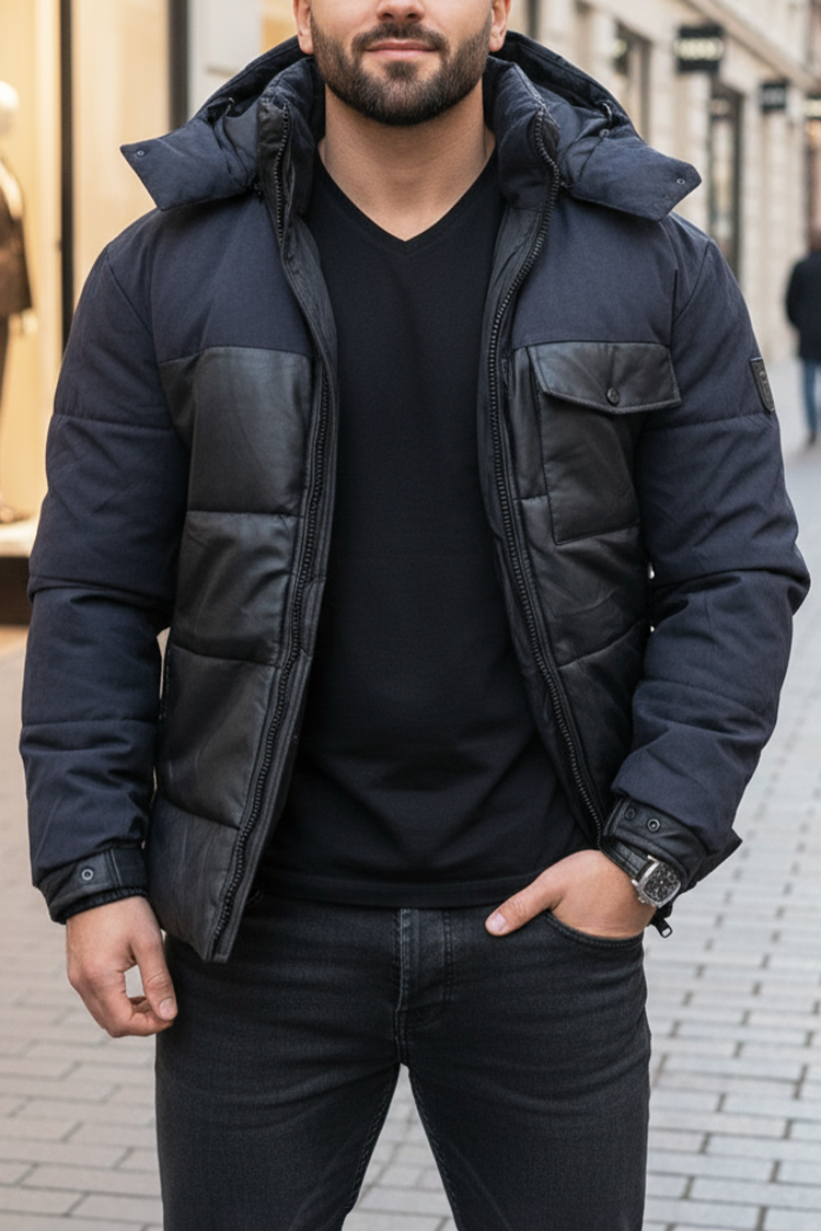 - Elegancka i nowoczesna męska kurtka zimowa w kolorze czarnym, łącząca styl i funkcjonalność.