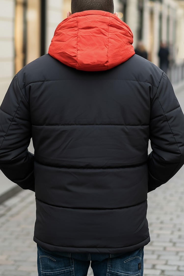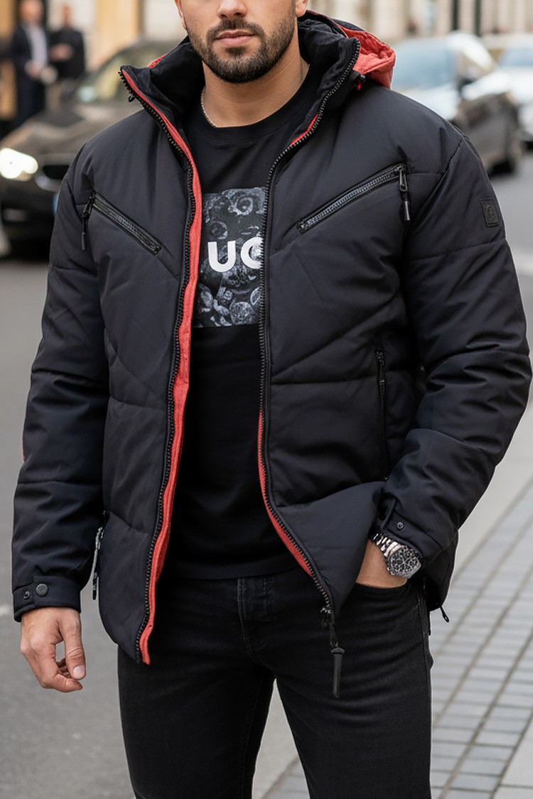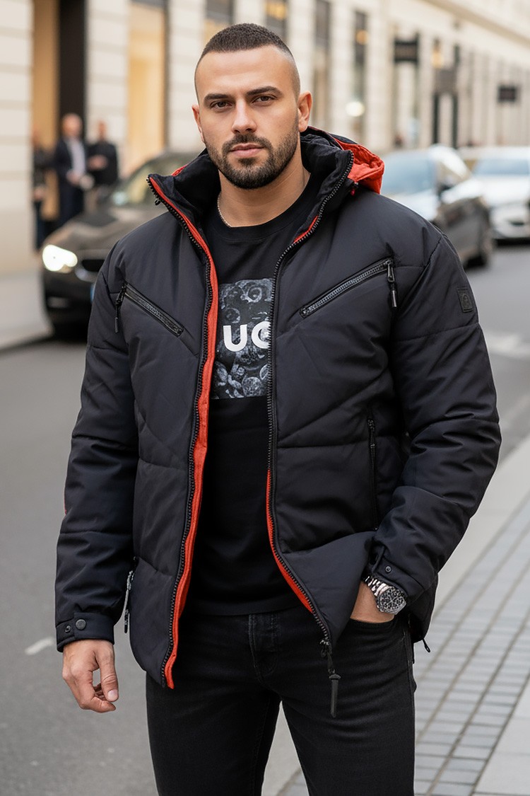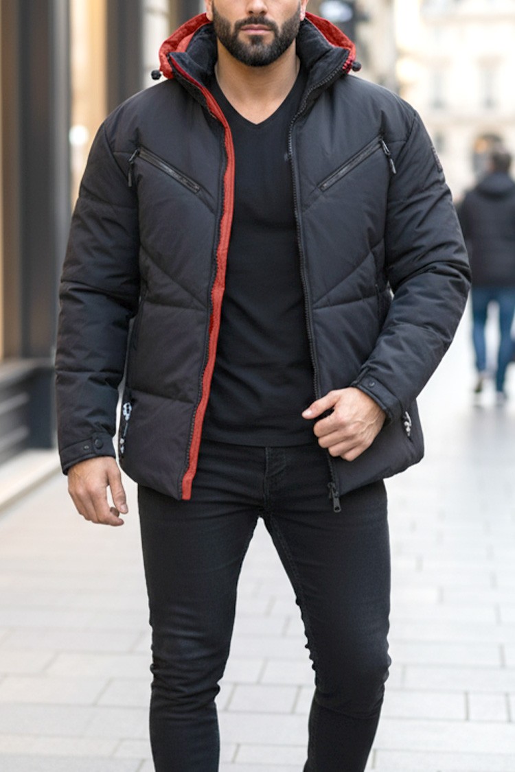 - Stylowa i ciepła męska kurtka zimowa w matowej czerni, łącząca wygodę z nowoczesnym, miejskim designem