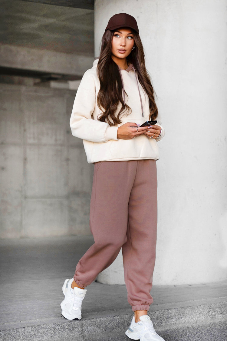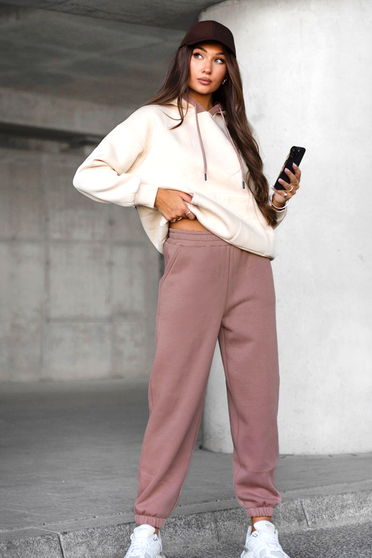 - Spodnie mają wygodny krój, wysoką gumkę w pasie i boczne kieszenie.